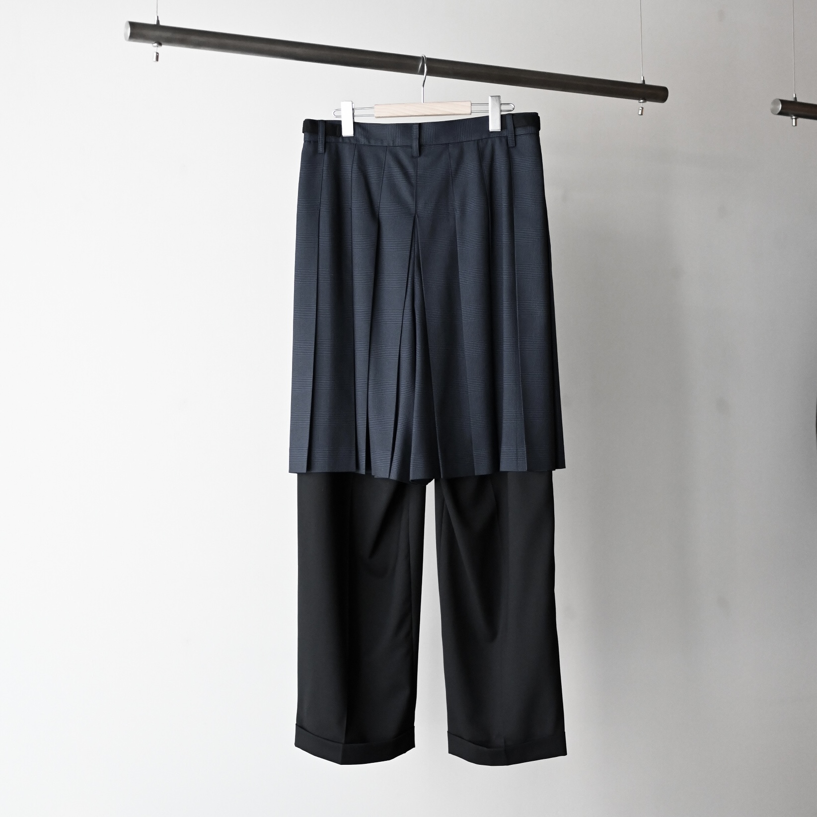 前面はショーツ、後面はプリーツがたくさん入ったことでスカートレイヤードの様なビジュアルとなるレイヤードパンツ。
