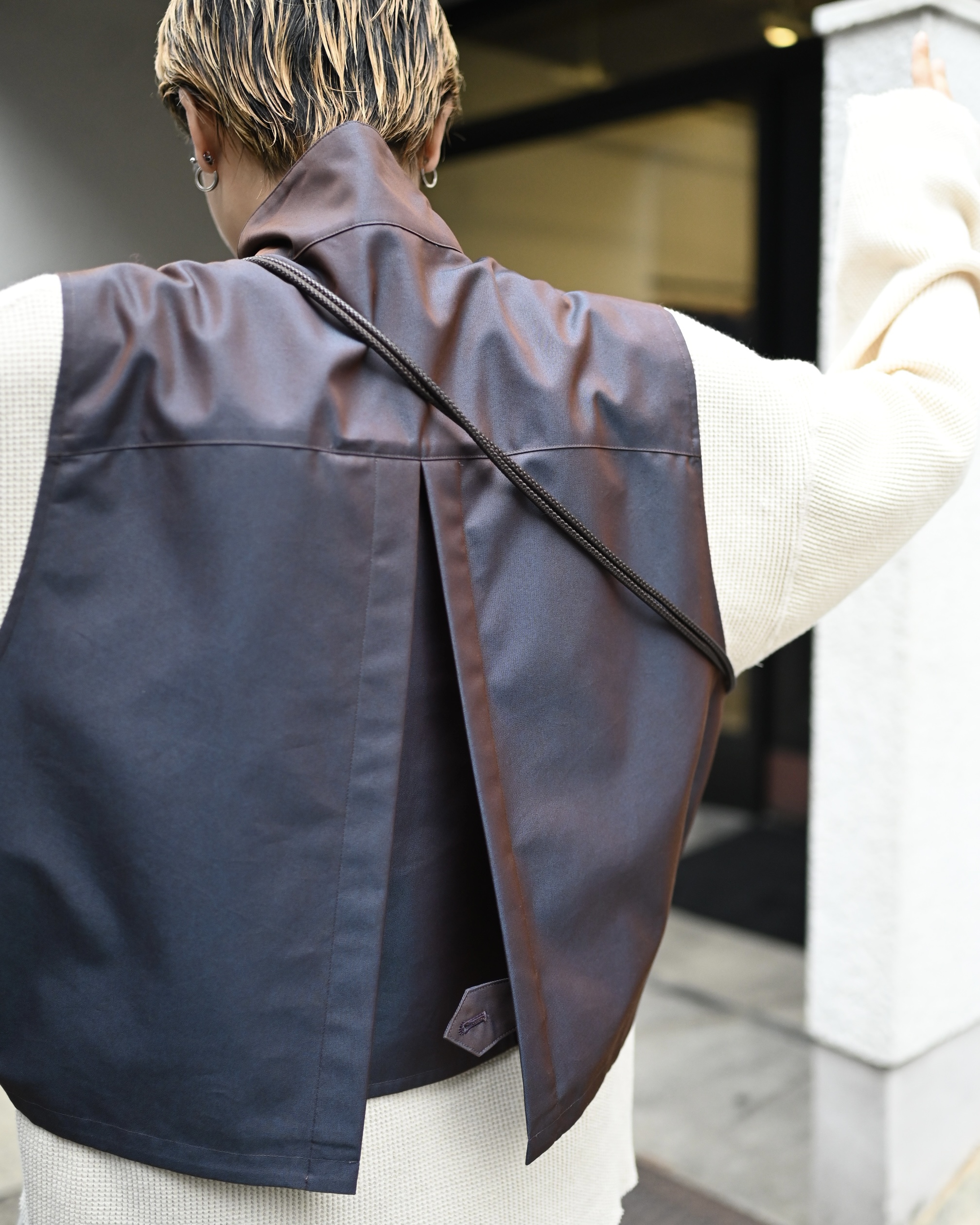 光沢のある生地を採用したリバーシブル仕様のドッグイヤー型ベスト。