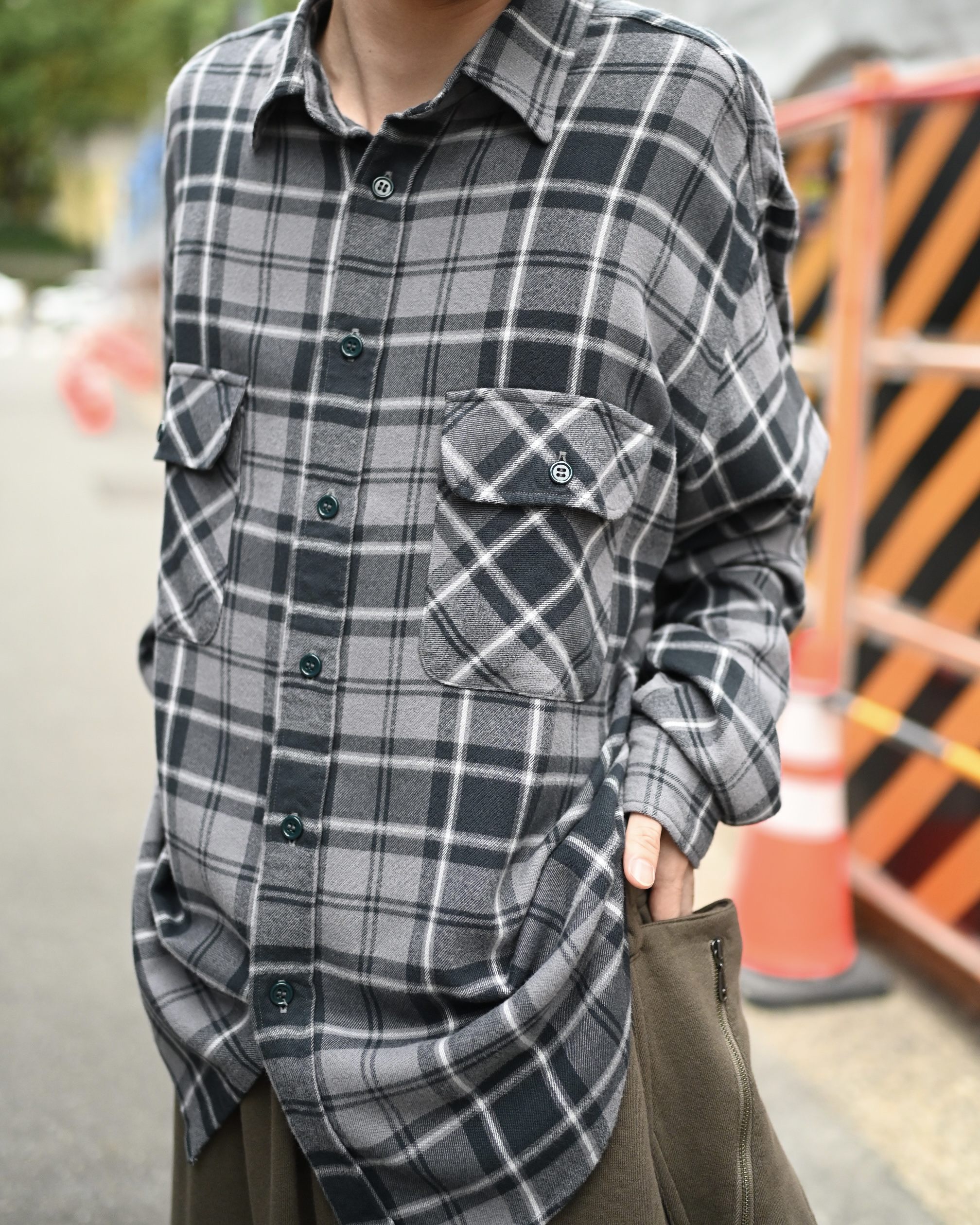 太番手のレーヨン糸を使用し肉感がありつつとろみと落ち感が特徴的なチェックシャツ。