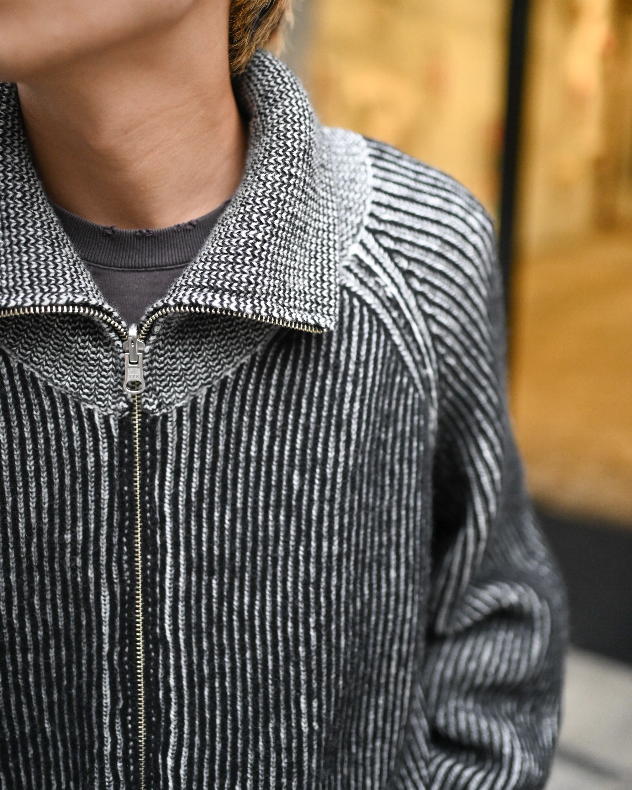 ネックはやや高め、ラグランスリーブ仕様のゆとりをもたせたサイジング。フルジップなのでカーディガン感覚でラフに着ていただきたいアイテム。各所のリブも緩めですが、オーバーすぎずだらしなくならない、絶妙な緩さをもたらしてくれます。