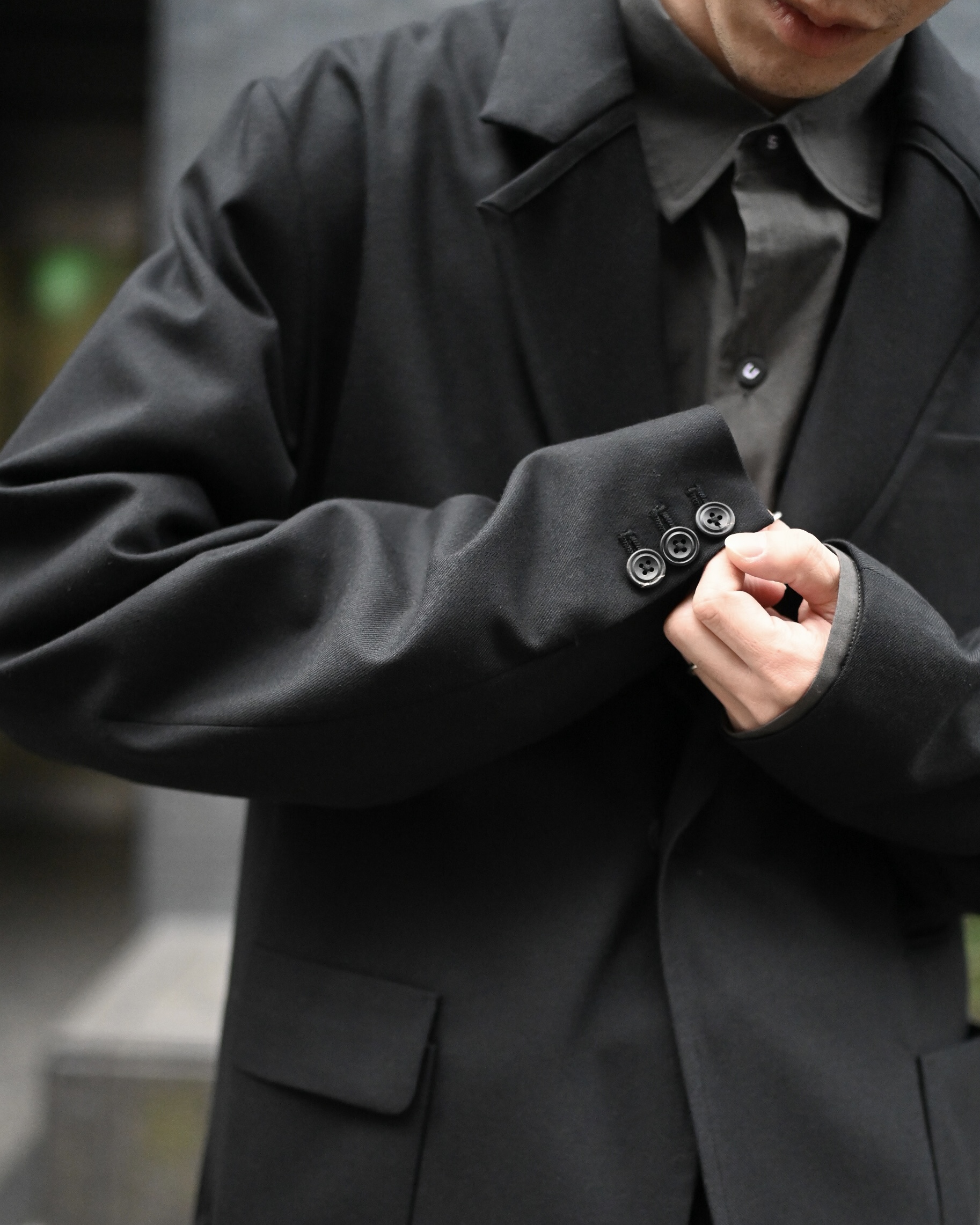 よりフォーマルに細部はアップデートされつつ、フロント1つ留めのスナップボタン仕様やサイドから紐付きのスナップボタンで身頃を絞って着用できる〈SUNSEA〉らしいデザインが、カチッとしたムードの中に大人な”余白”を感じるテーラードジャケット。