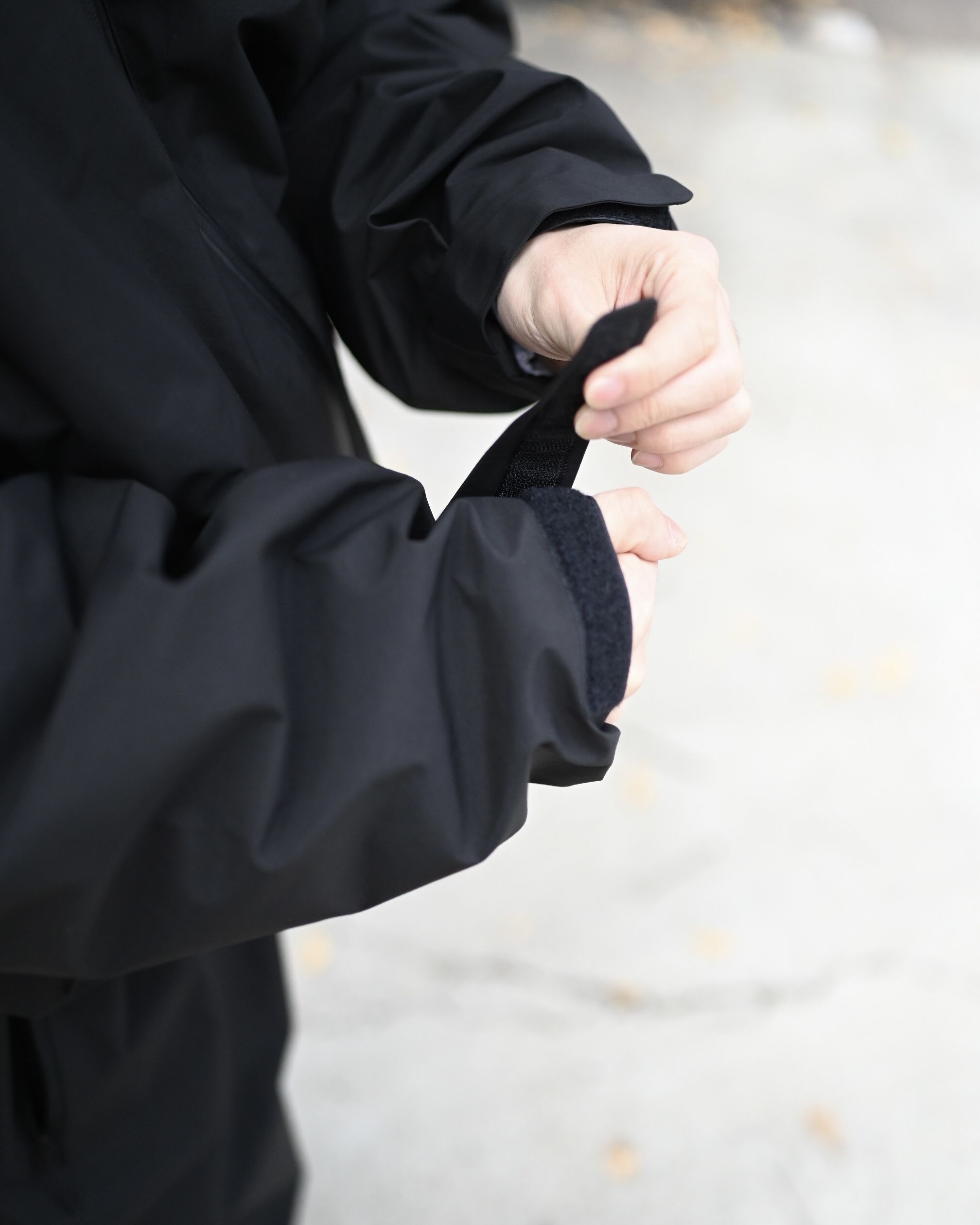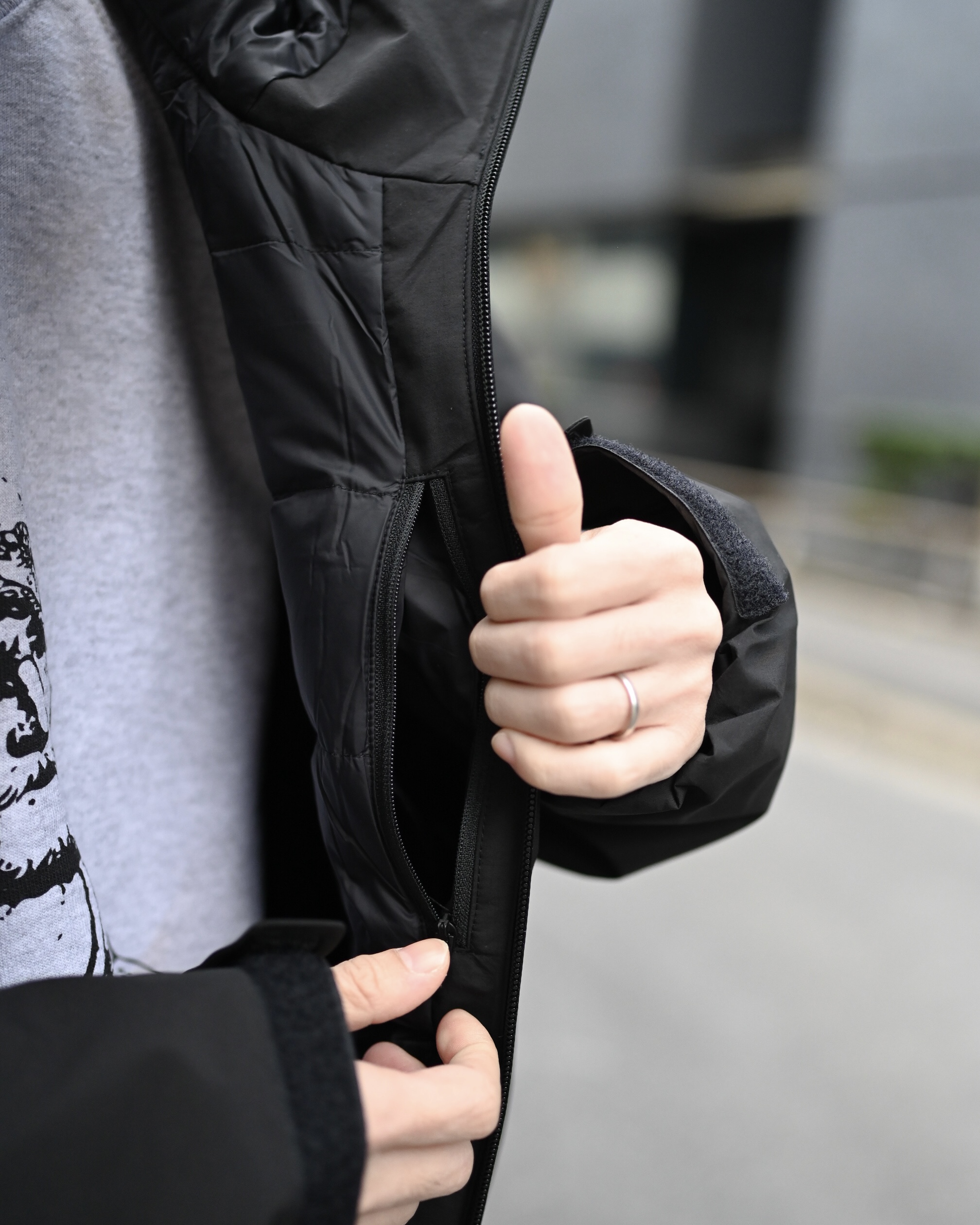 ハイスペックな各所のディテールに加え、ダウン95%・フェザー5%の保温性も確保されつつ、軽快な着心地に仕上がっております。口元を覆うほどのネックに袖はマジックテープでの調整可能、裾にはドローコード付きと、控えめながら痒い所に手が届いた細部のデザイン性も魅力的。