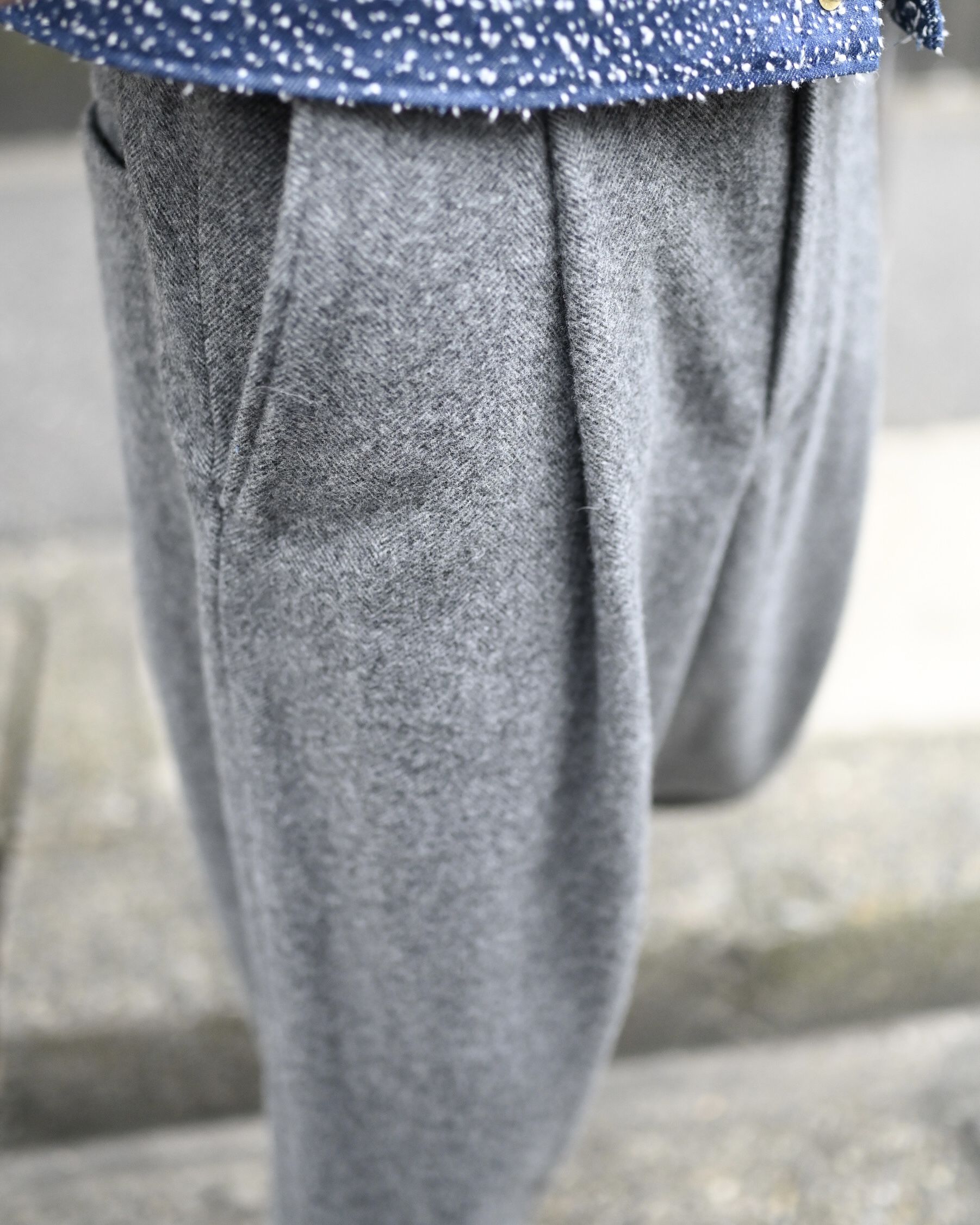 上記でご紹介したブルゾンとセットアップ展開となるウールツイード生地の1タックパンツ。