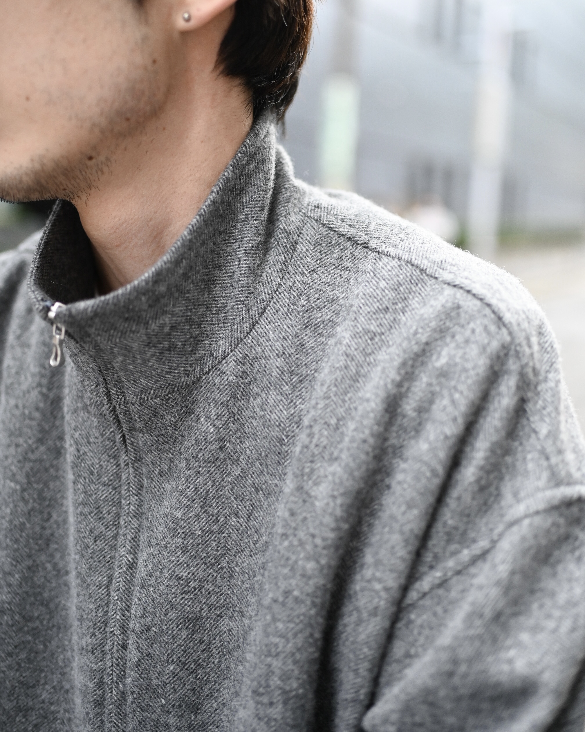 ウールをベースにナイロンやその他の混紡素材がミックスされ、軽やかで程よいハリのあるウールライトツイード生地のジップアップブルゾン。