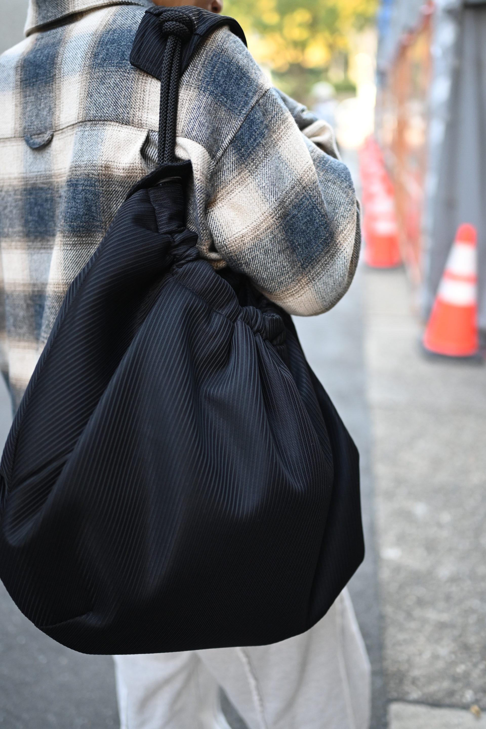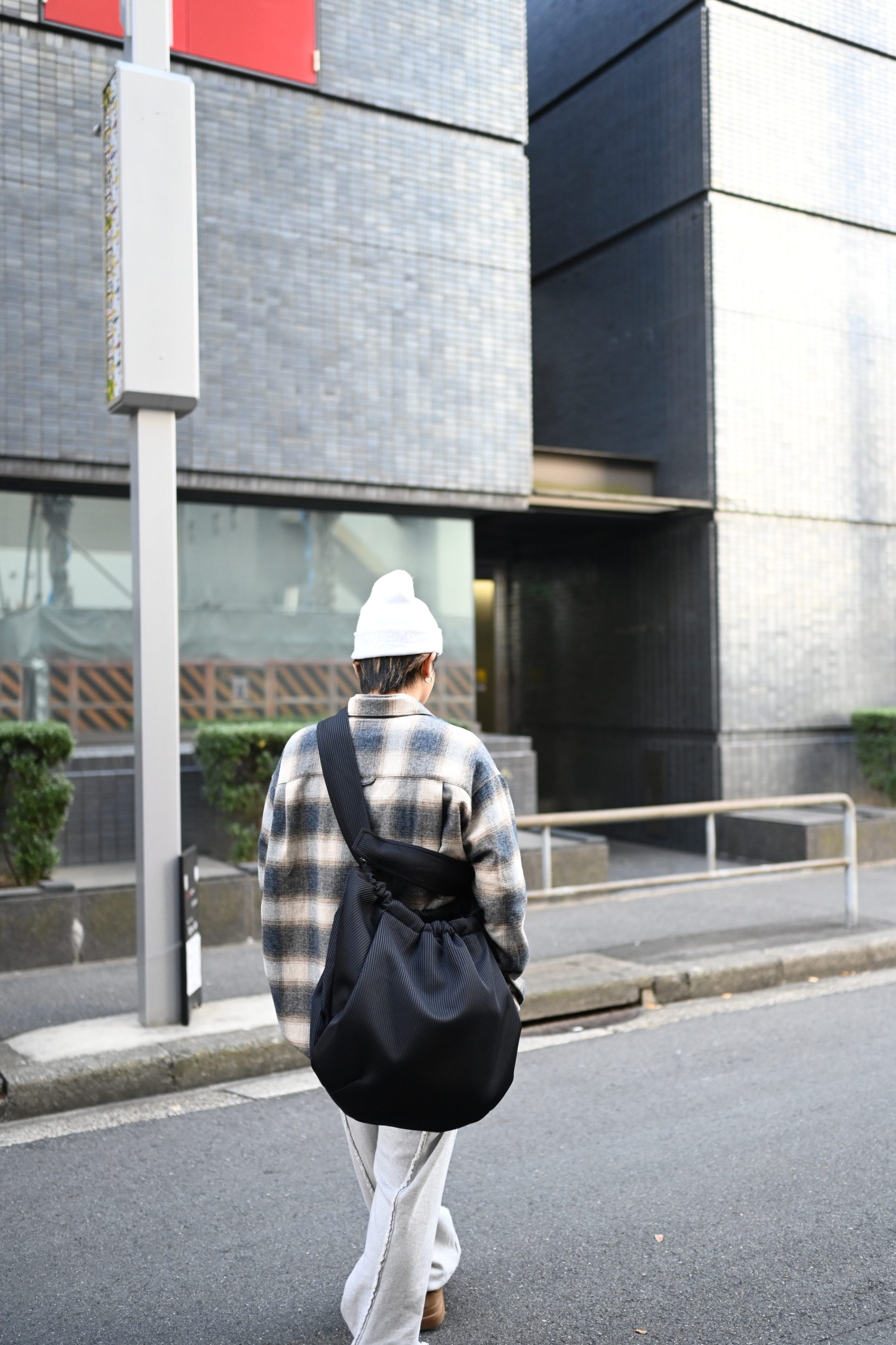 カーシートやクッション材としても使用されるダブルラッセル素材を採用し、軽さと耐久性を兼ね備えつつ、タックによって丸みのある独特なフォルムが特徴的なバッグ。サイズ調節機能として取り付けられているロープデザインも程よいアクセントに。もちろんバッグとしての収納力も抜群で小旅行からデイリーユースまでおすすめです。