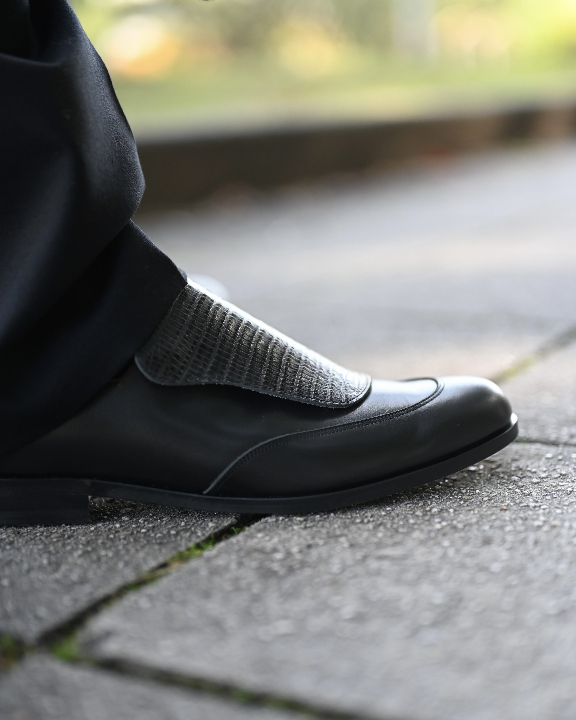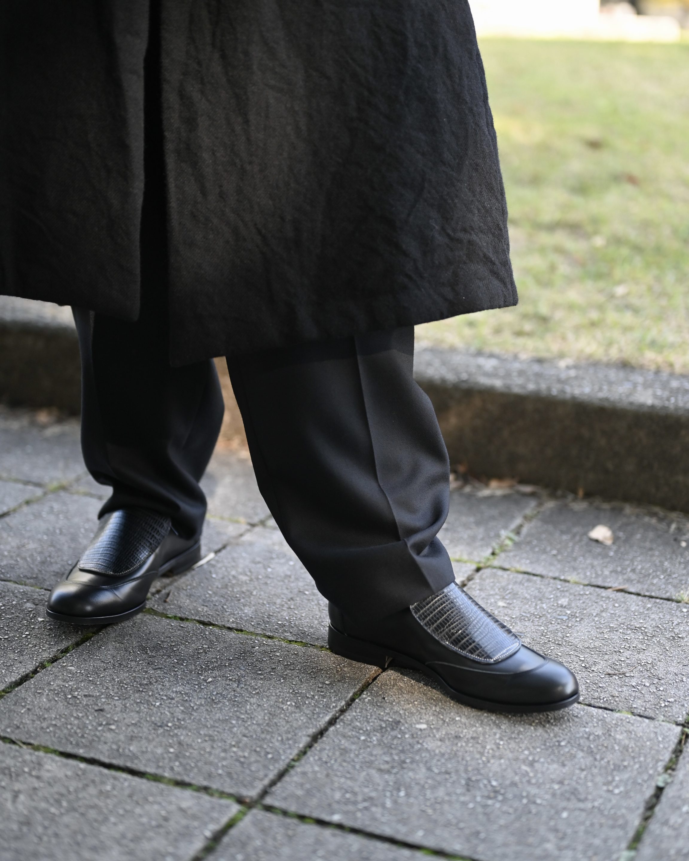丸みを帯びたややボリューミーなフォルム且つ、足の先端にかけて適度にシェイプがかけられた素晴らしいバランス感覚によって形成されてながら、その1番の特徴はクロコ箔押しレザーによって、アッパー部分の紐をまとめて覆い被すように取り付けられたミニマル且つインパクトあるデザインです。