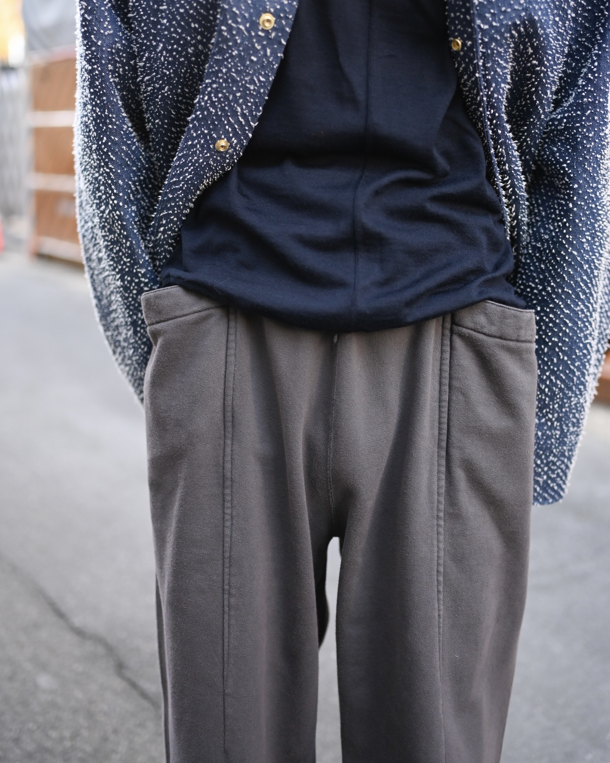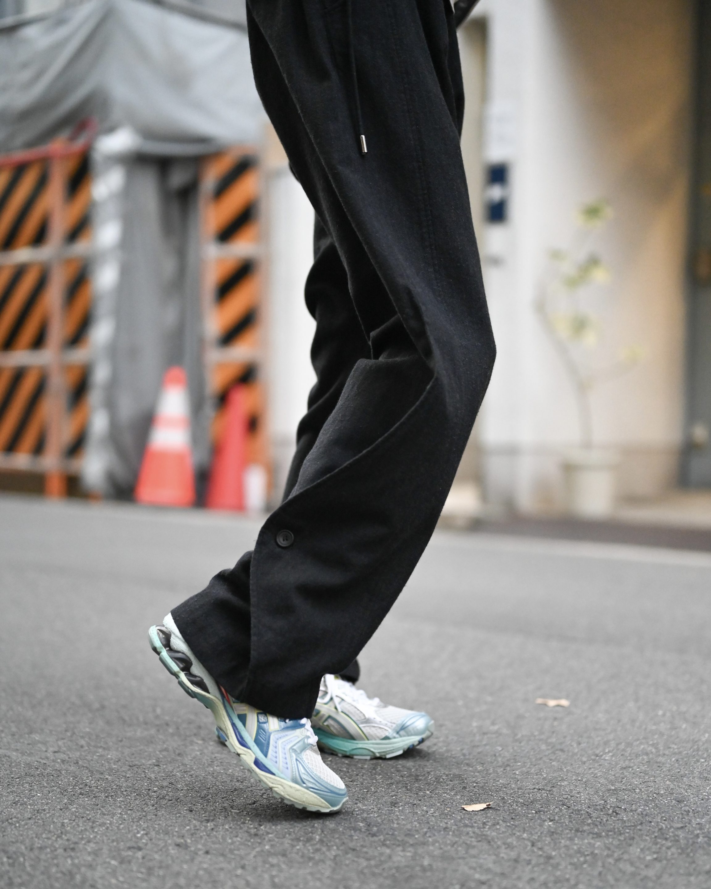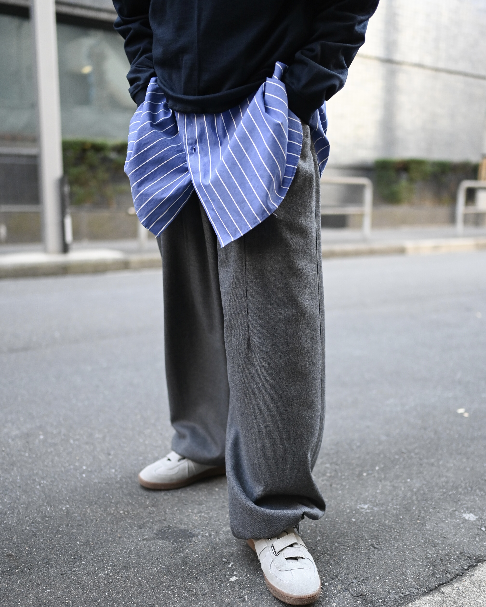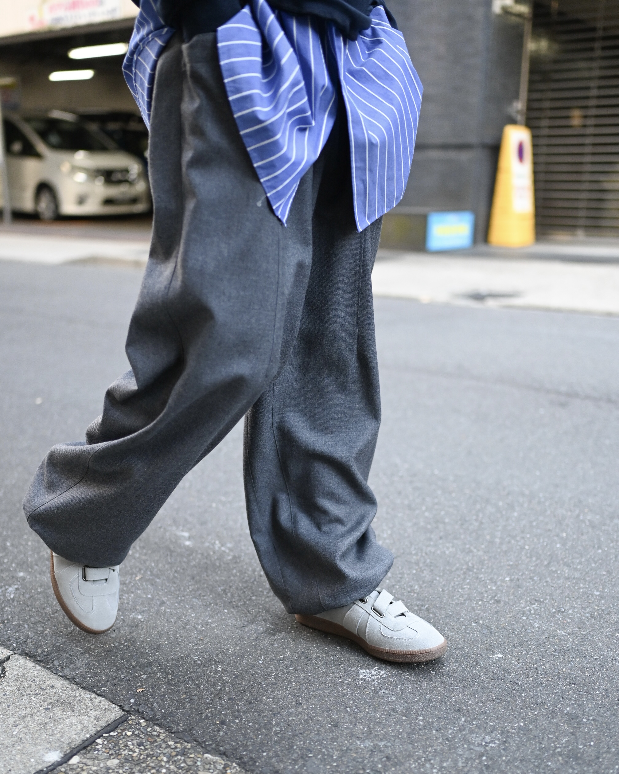 上記でご紹介した「WIDE WOOL TROUSERS」 と同型でスウェットのいなたさが排除された綺麗なシルエットに収まっており、色味も含めて新鮮なパンツとして取り入れて頂きやすいかと思います。