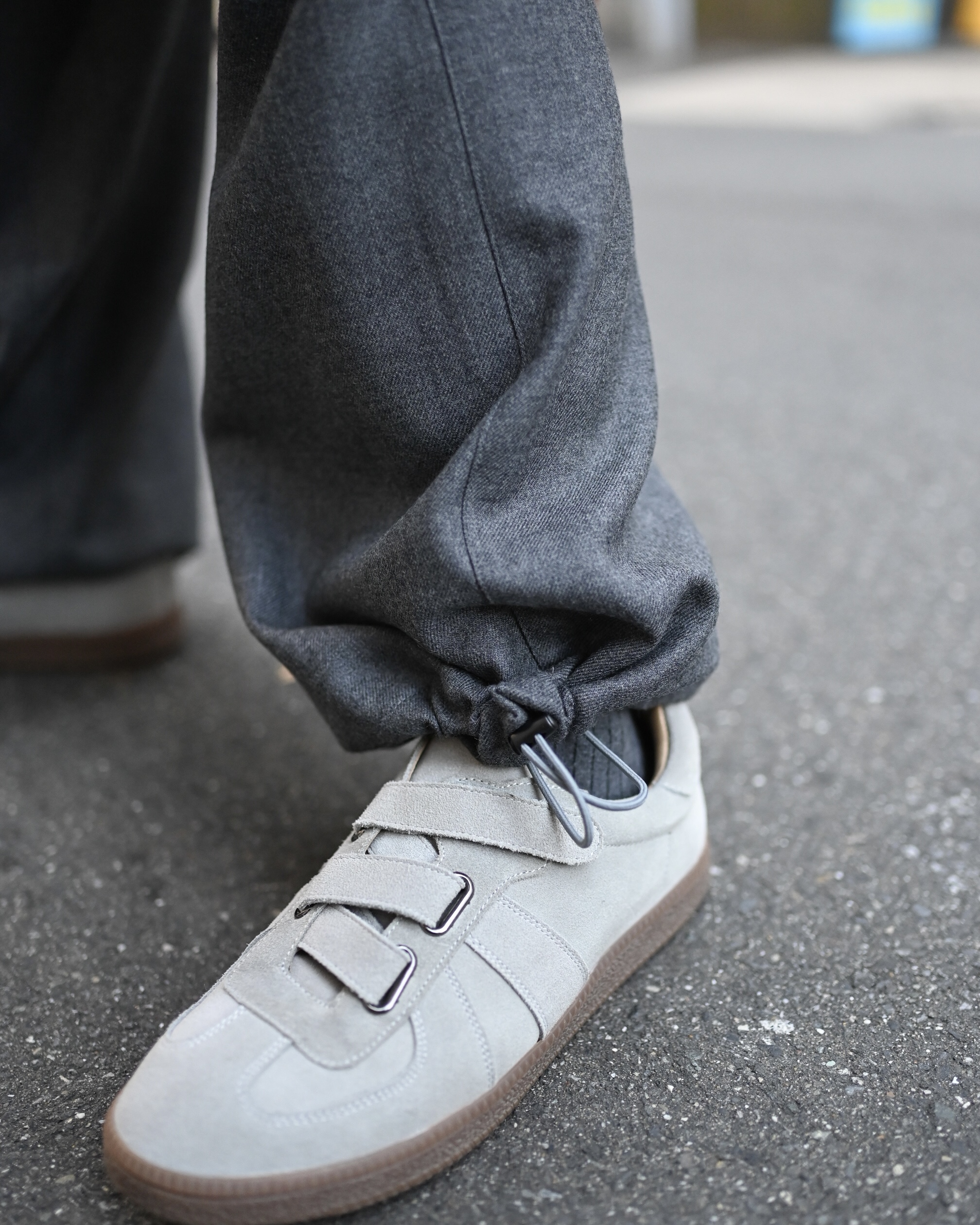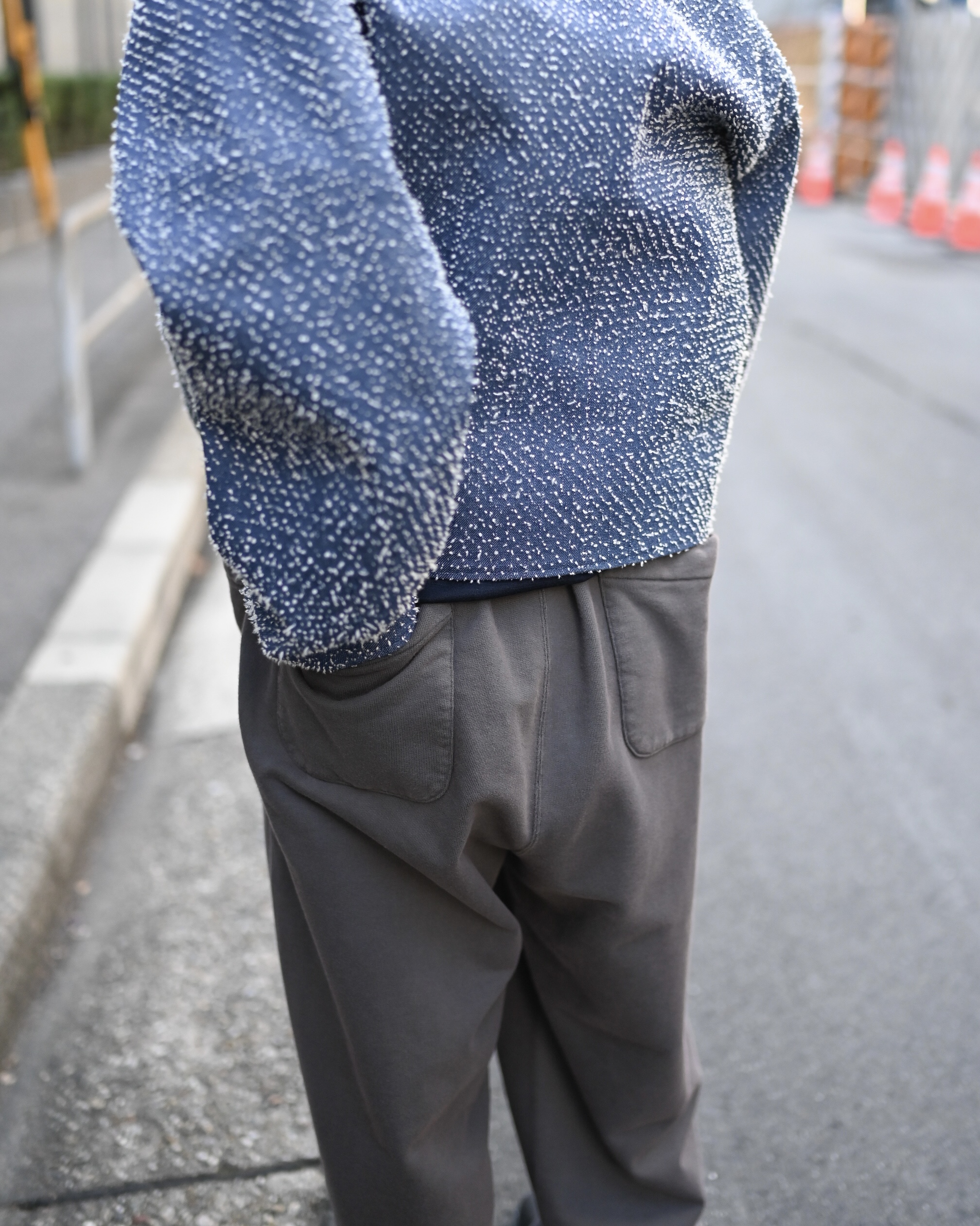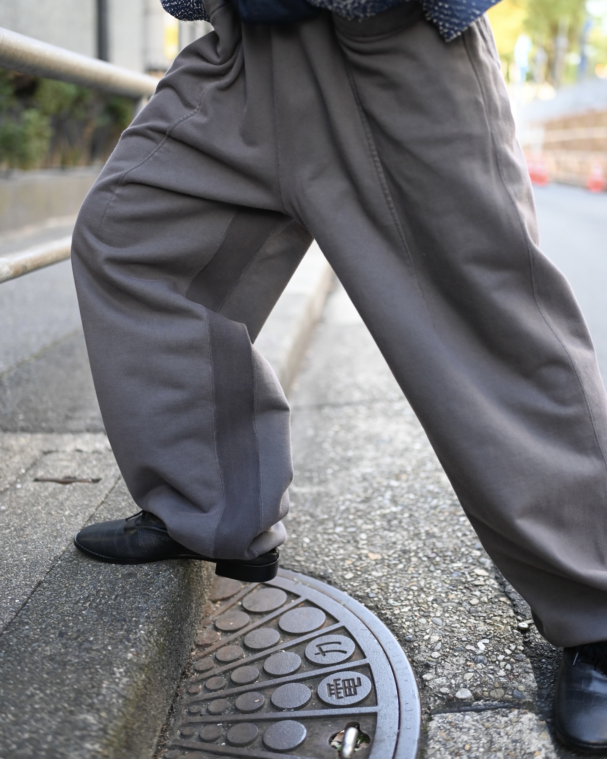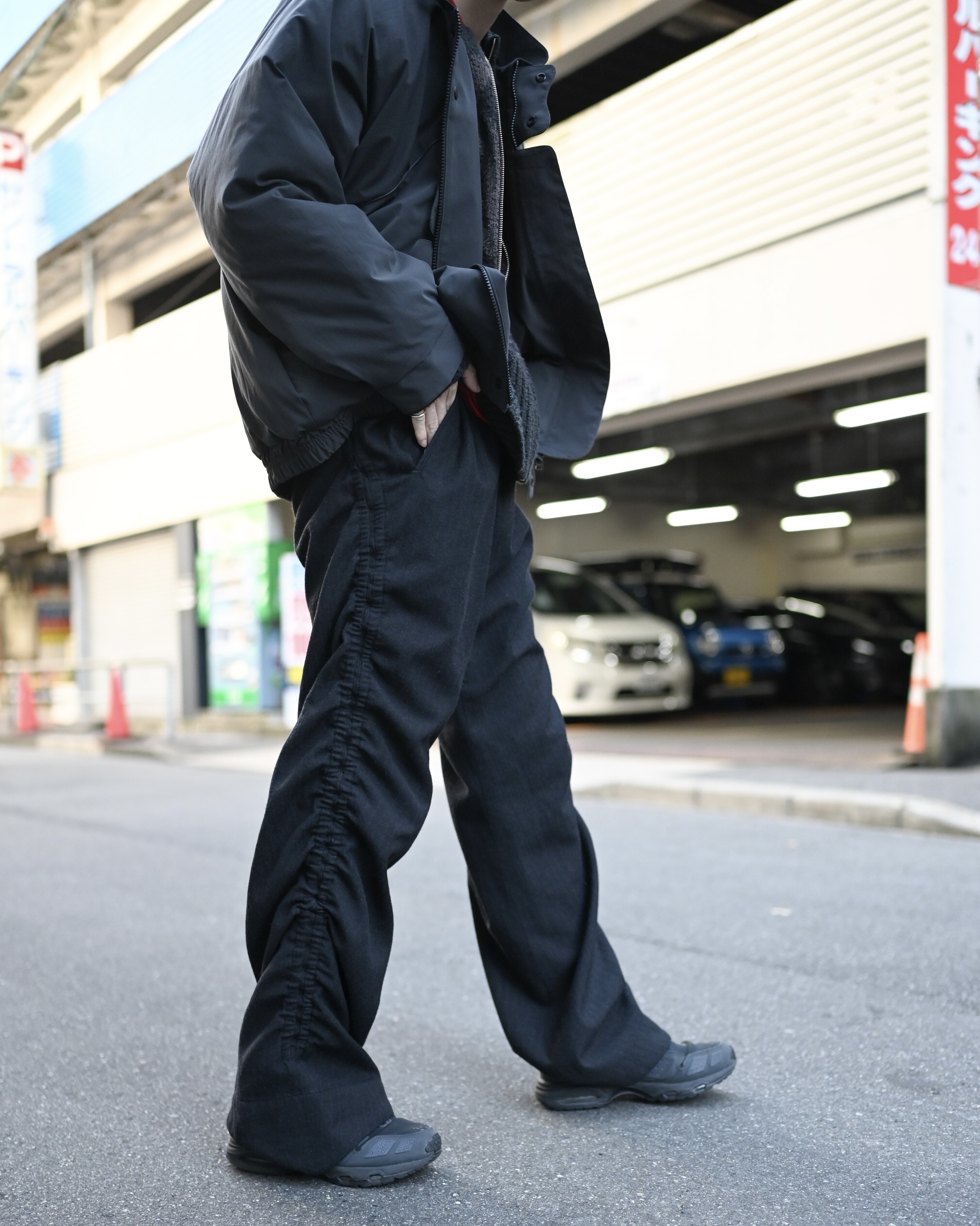 上記でご紹介した「WIDE WOOL TROUSERS」 と同型でスウェットのいなたさが排除された綺麗なシルエットに収まっており、色味も含めて新鮮なパンツとして取り入れて頂きやすいかと思います。
