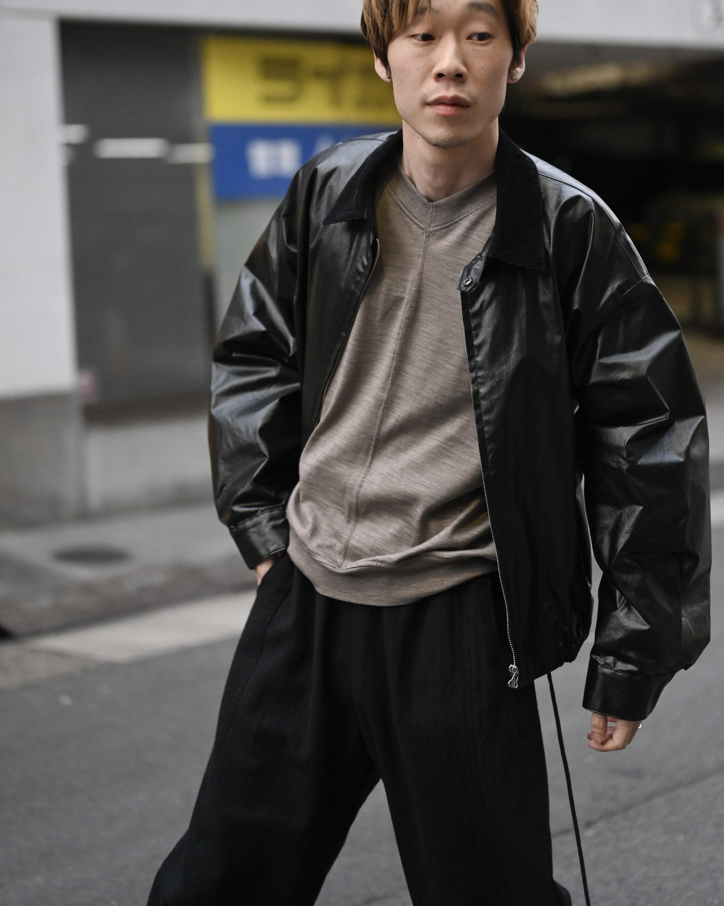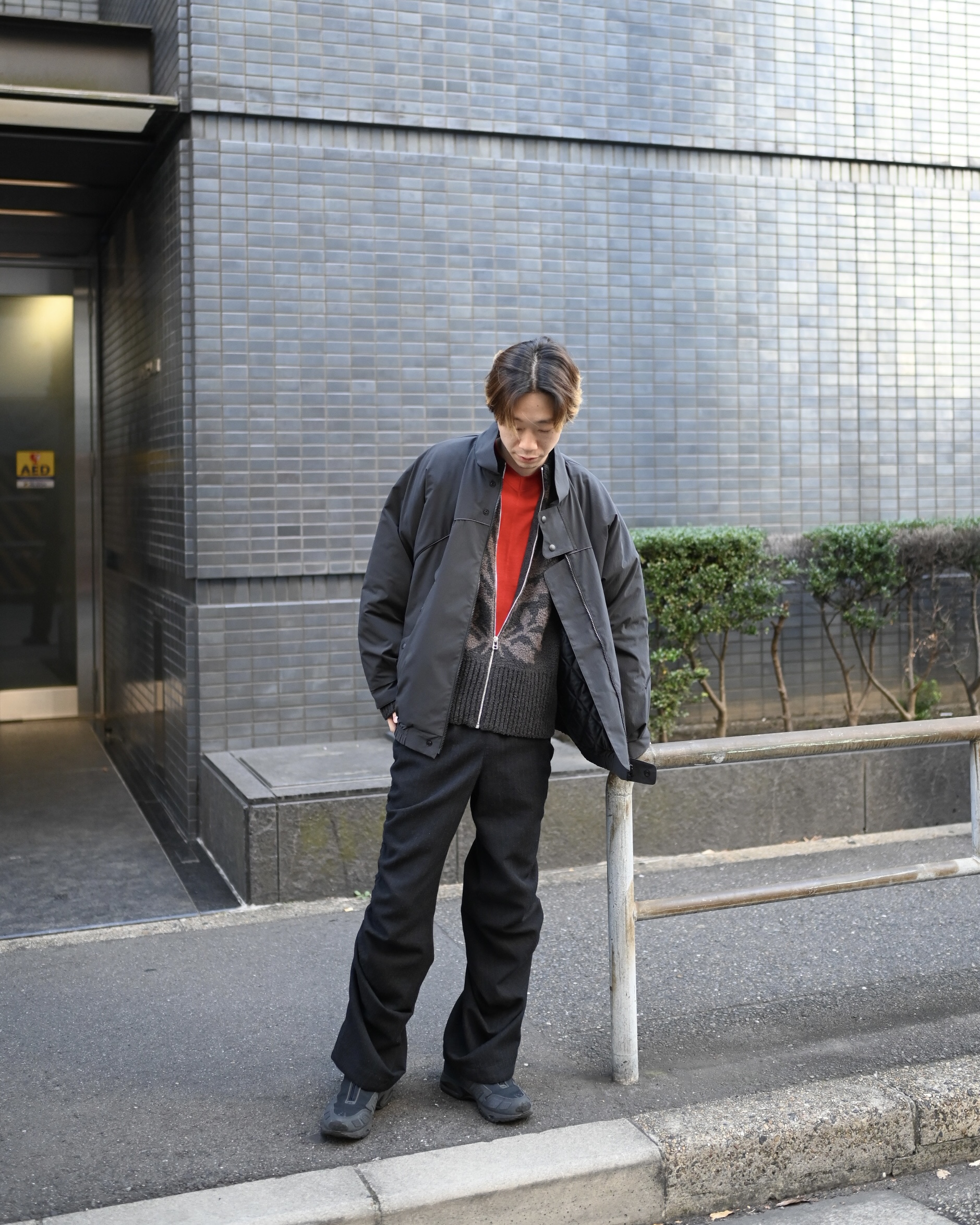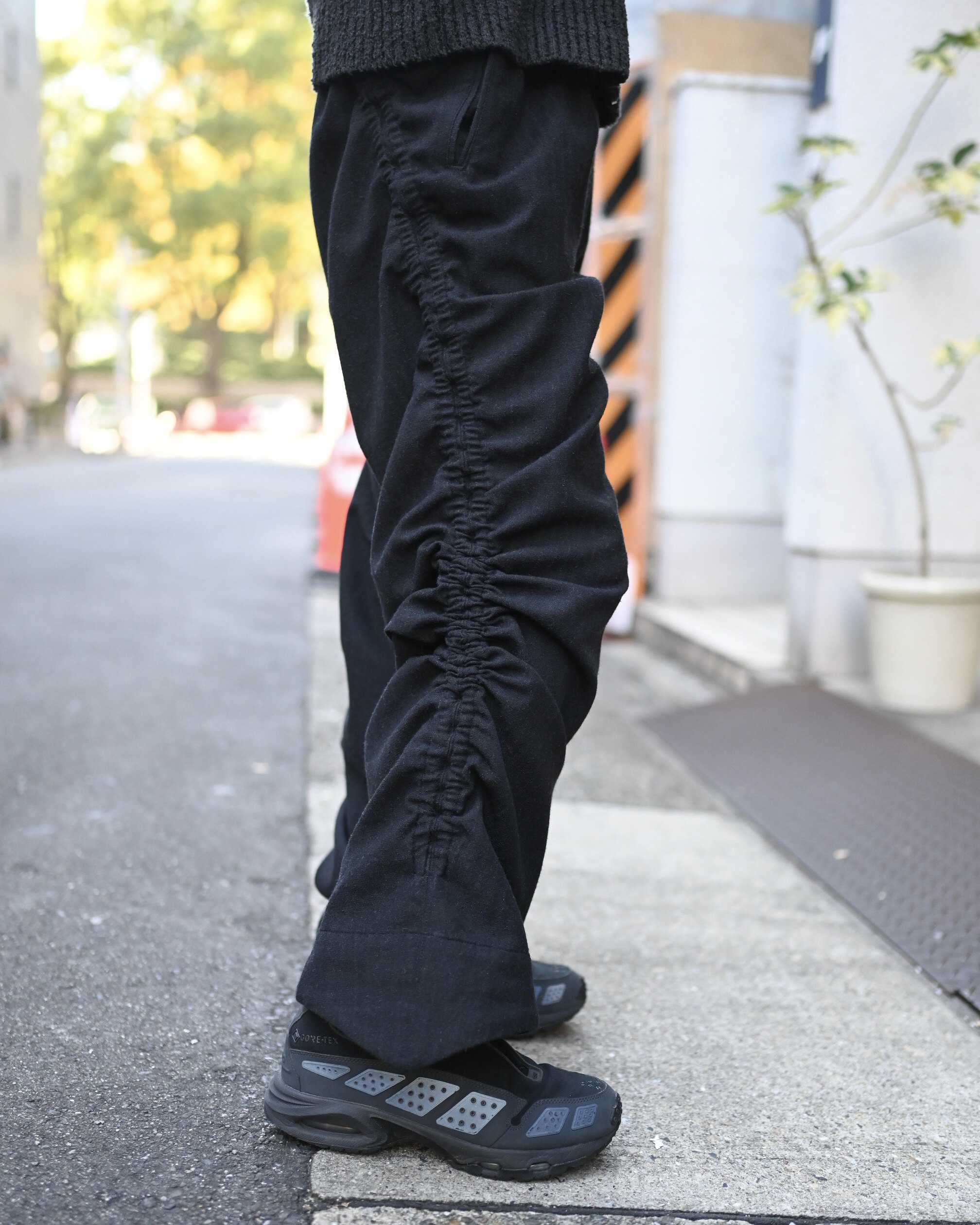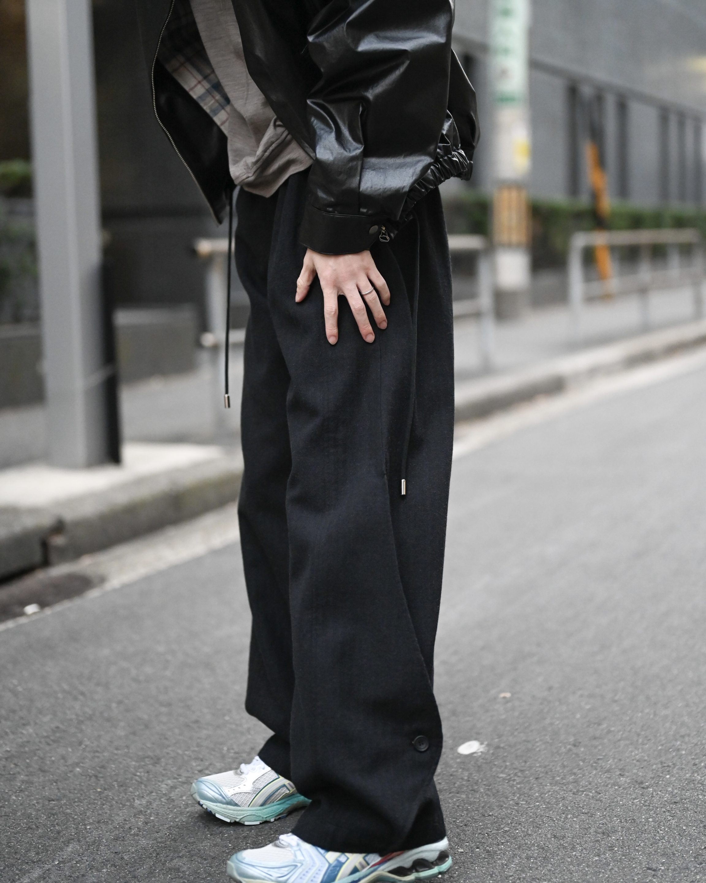 上記でご紹介した「WIDE WOOL TROUSERS」 と同型でスウェットのいなたさが排除された綺麗なシルエットに収まっており、色味も含めて新鮮なパンツとして取り入れて頂きやすいかと思います。