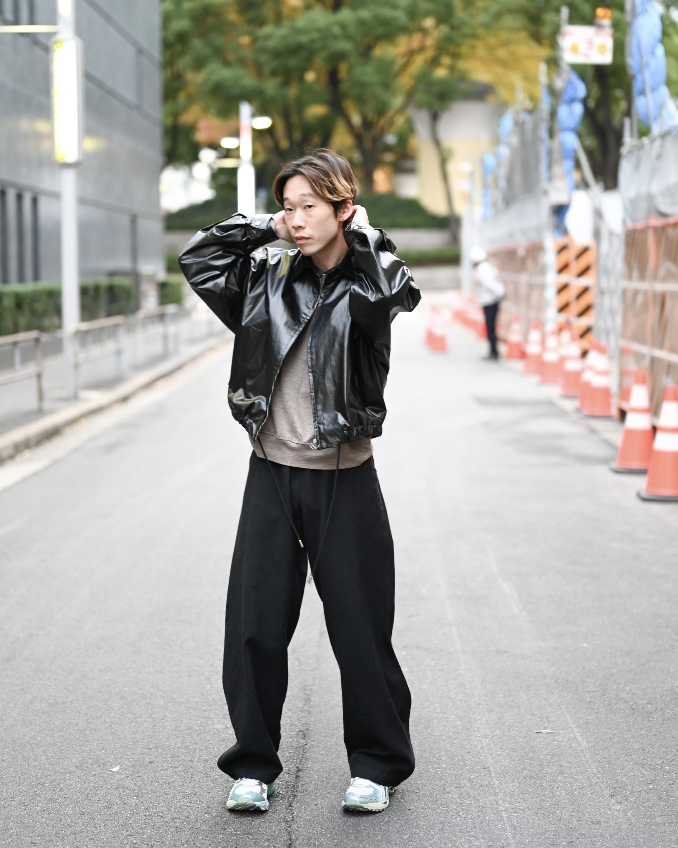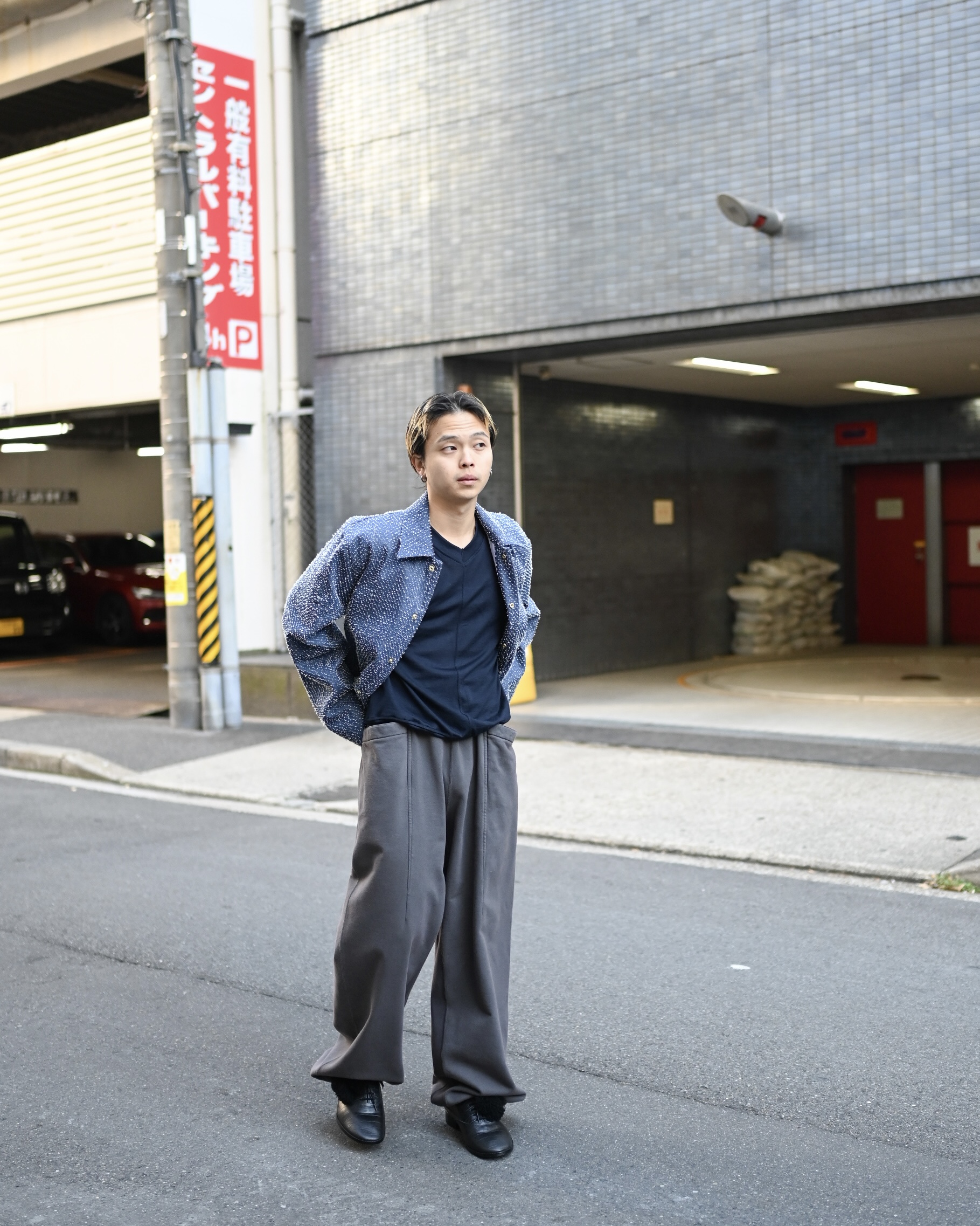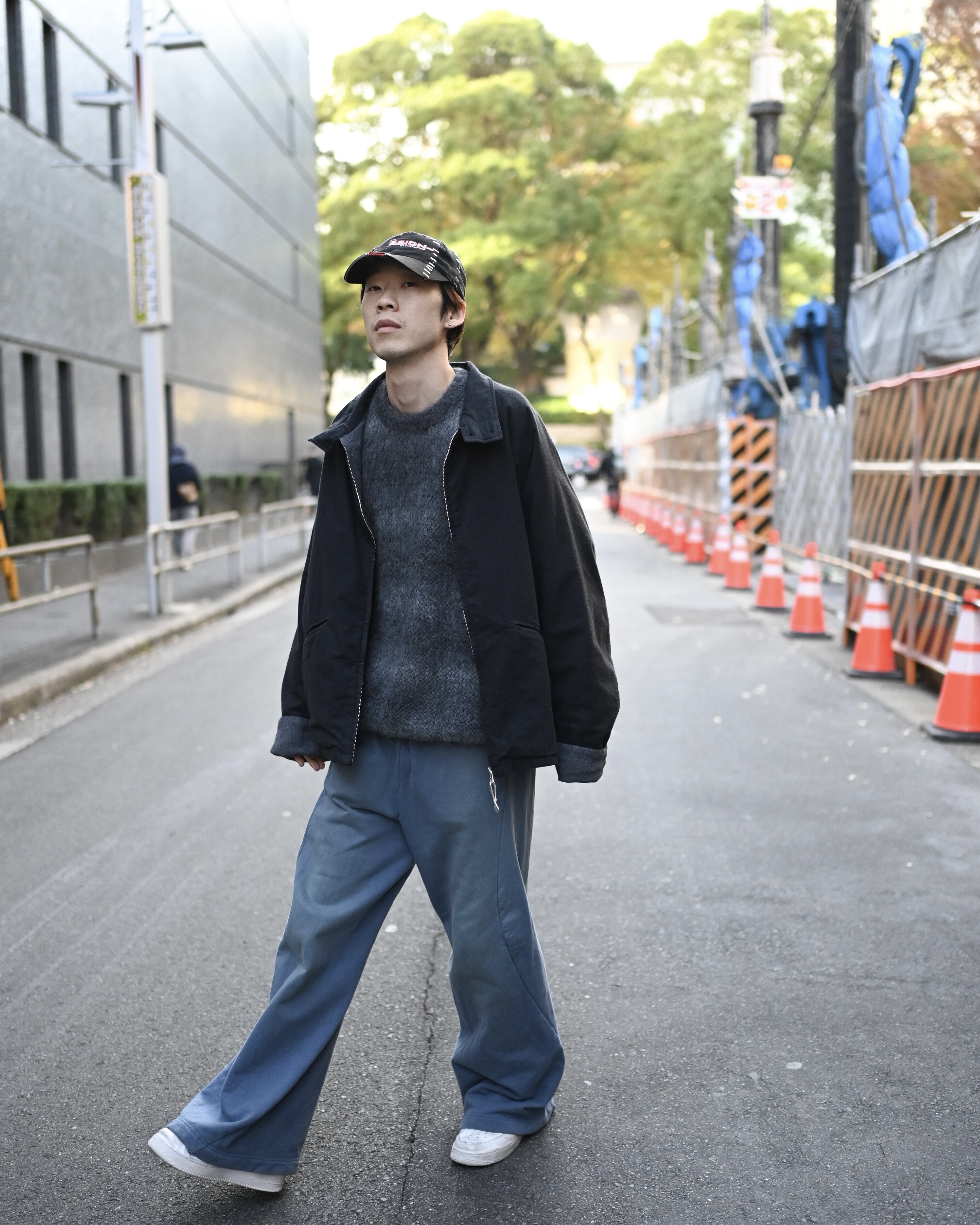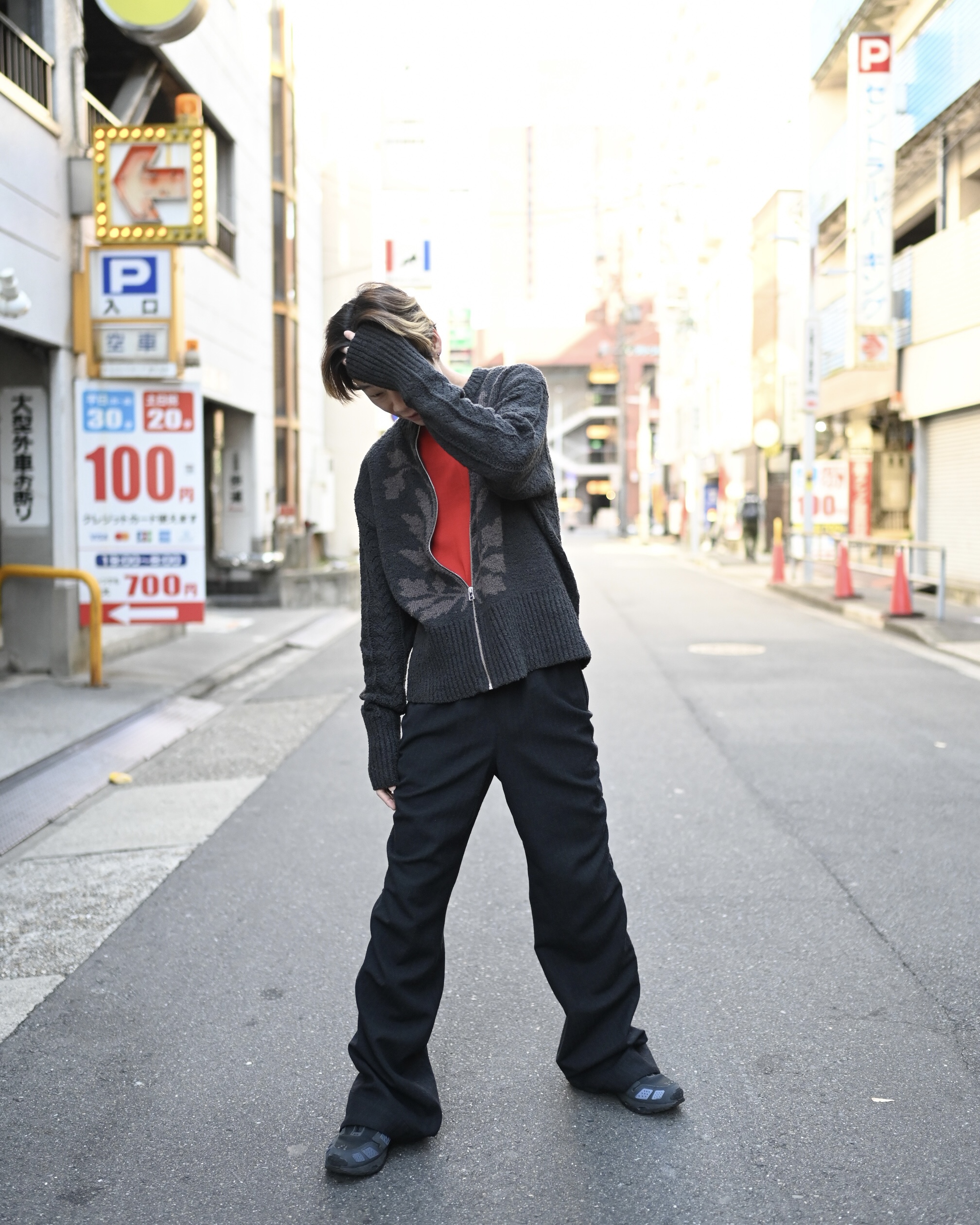 上記でご紹介した「WIDE WOOL TROUSERS」 と同型でスウェットのいなたさが排除された綺麗なシルエットに収まっており、色味も含めて新鮮なパンツとして取り入れて頂きやすいかと思います。