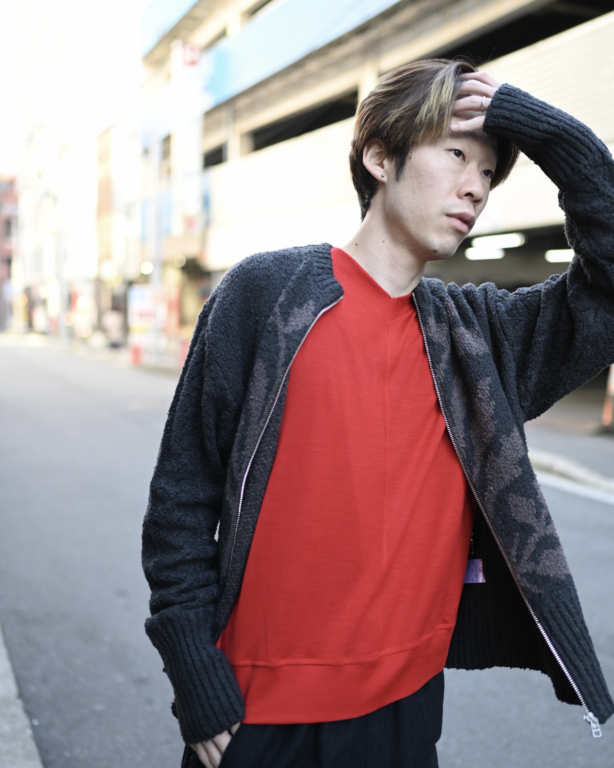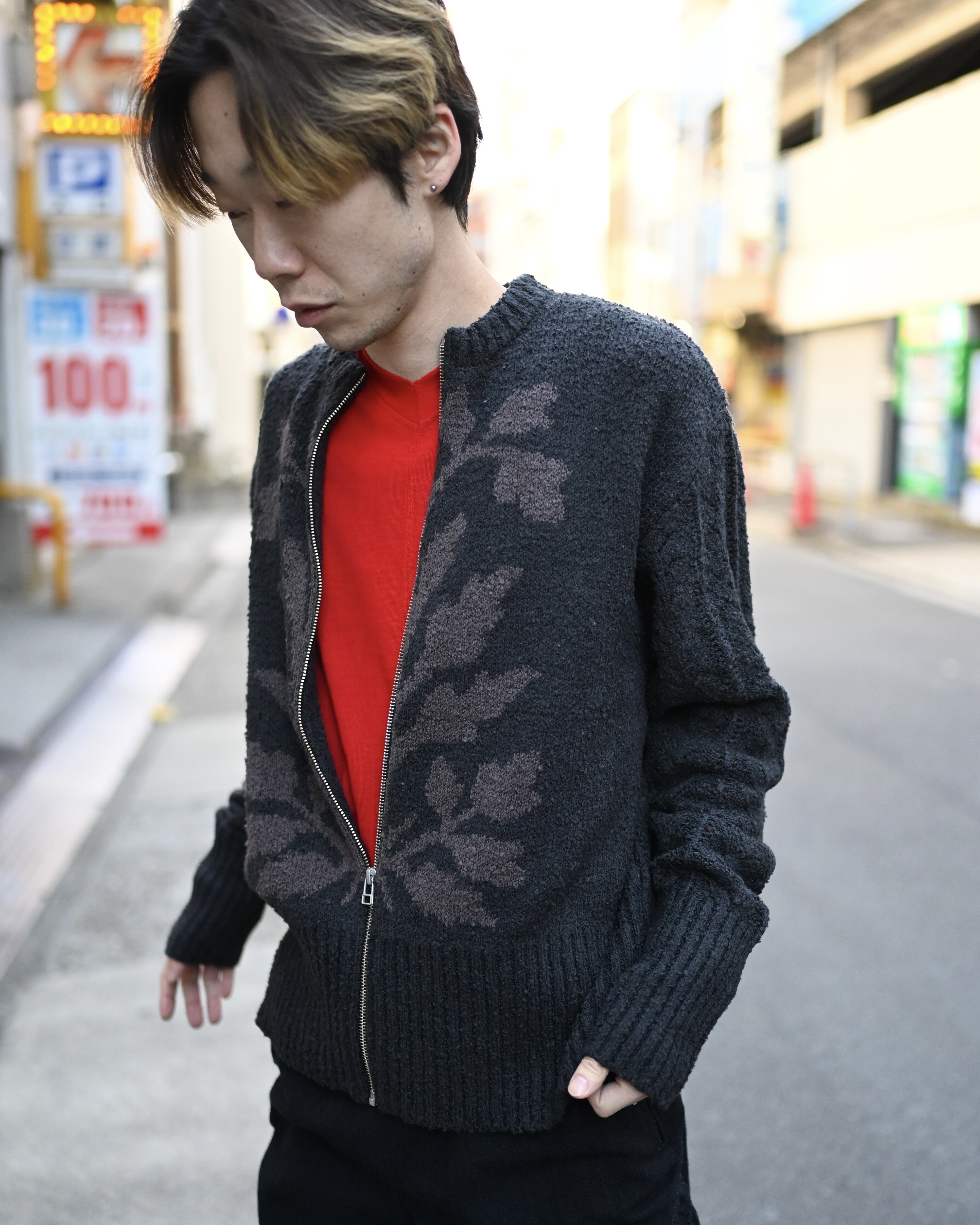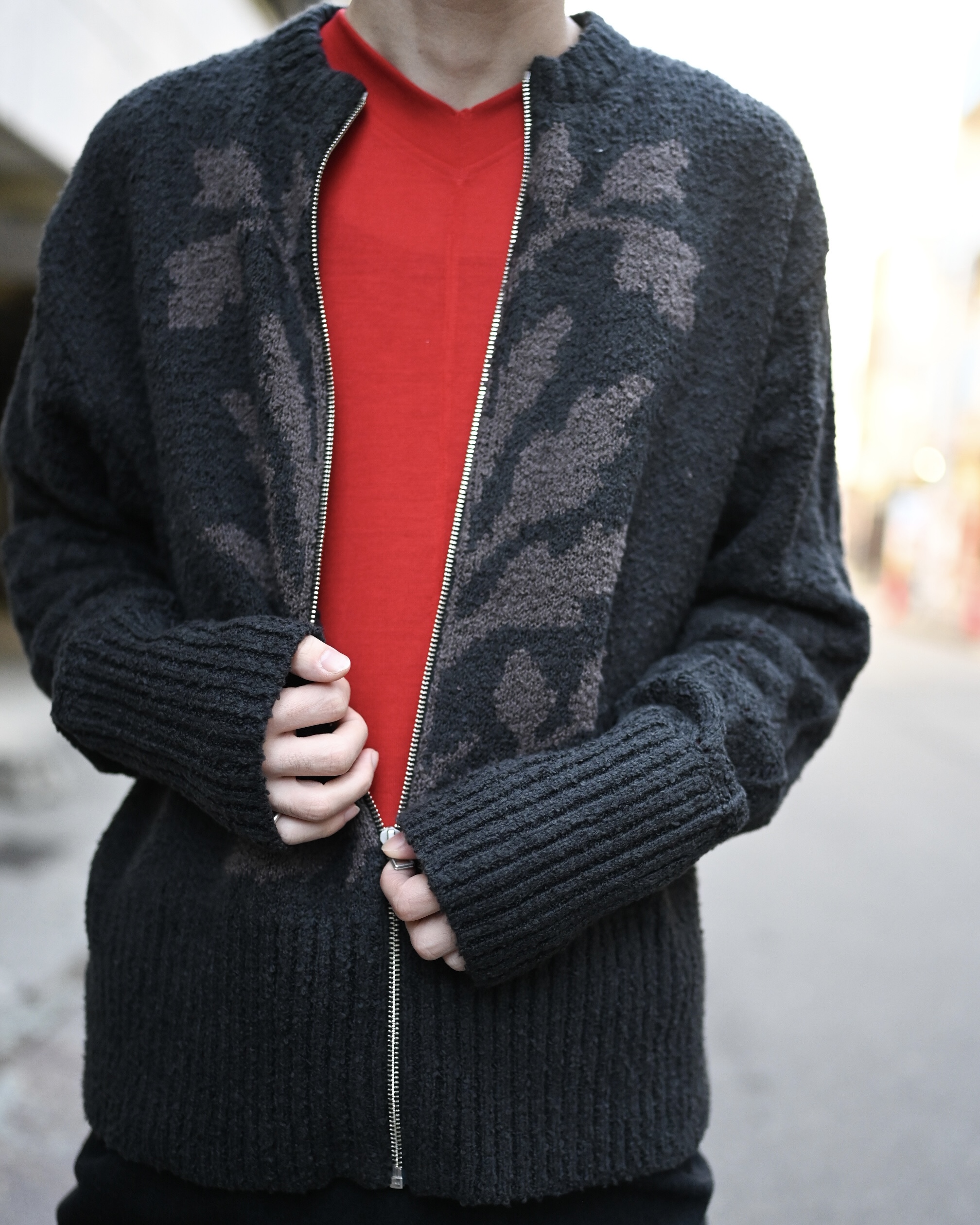 裾・袖のリブ幅を広めにしつつも、全体的にタイトフィットなフルジップ仕様。ニットの不規則なムラ具合も着古されたヴィンテージのニットのような生地感でどこか安心感のある馴染み方をします。
