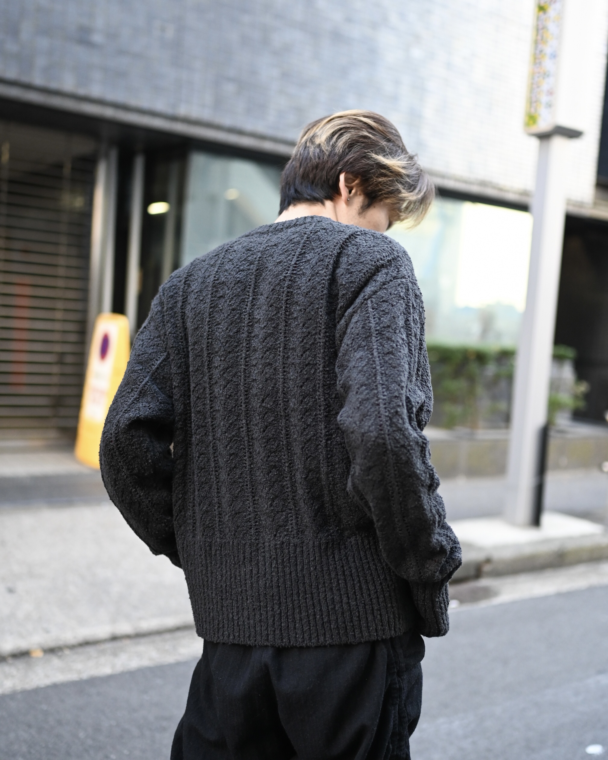 コットンスラブ糸を使用し、前身頃は天竺編みで切り絵のような柄が入り、袖・後身頃は透かし編みにした「PAPER-CUT KNIT BLOUSON」。