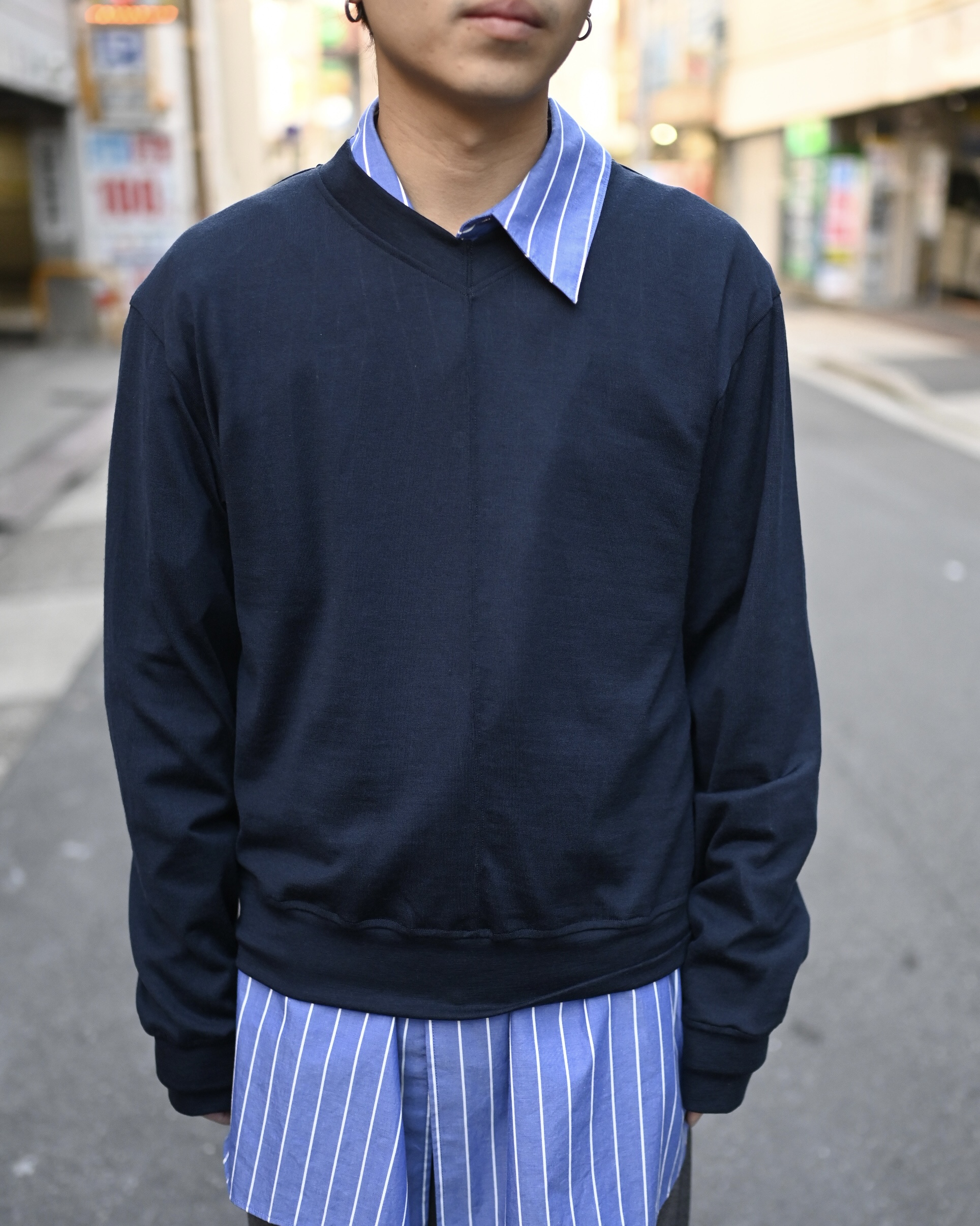 インナーとしての役割が多くなるであろうこれからの時期には薄手で嵩張らず着込めて重宝する存在。浅めなVネックなので春先には一枚での着用も可能なシーズン需要の長いアイテムです。インナーまで妥協の許さない服好きの方にこそ、オススメしたいアイテムです。