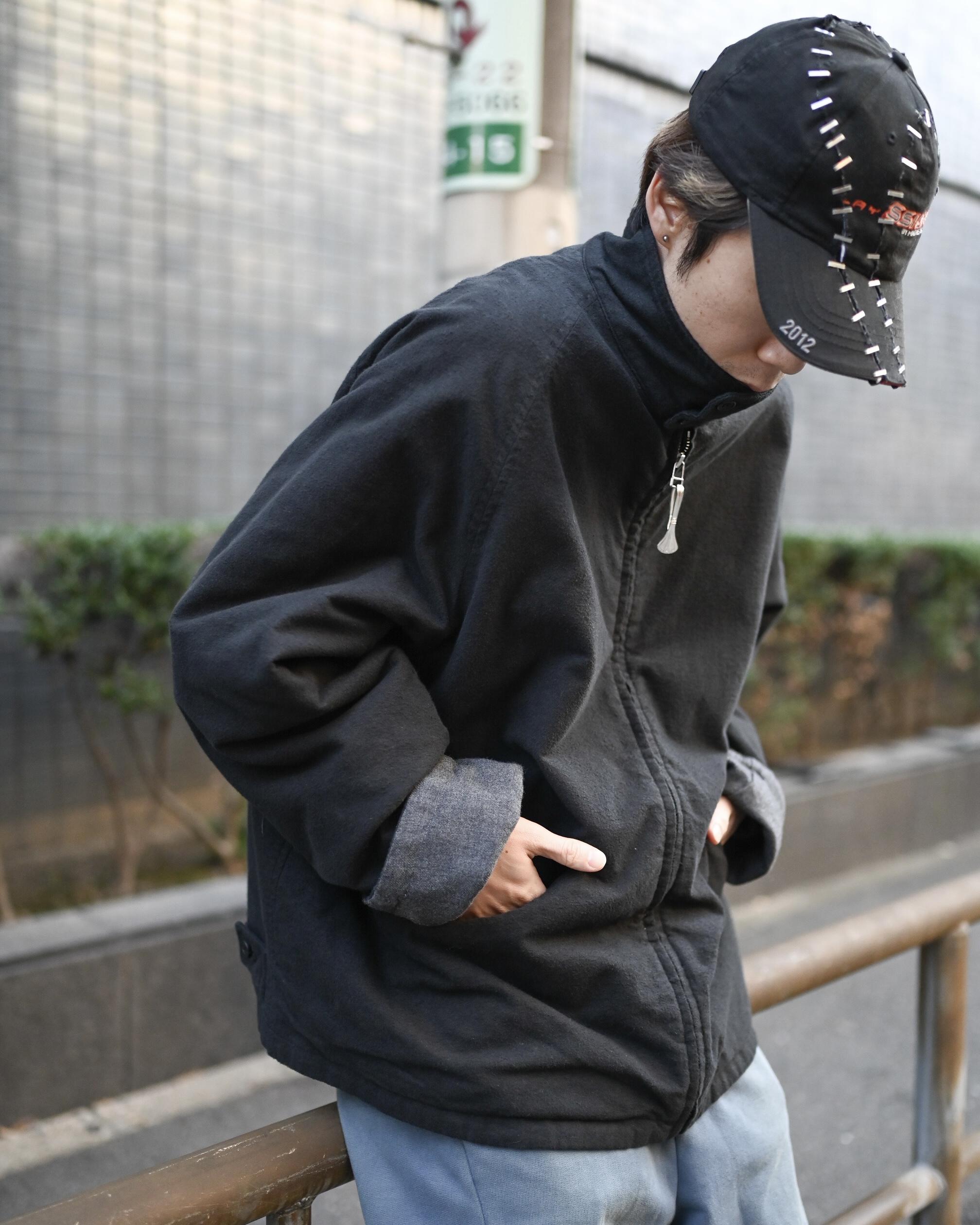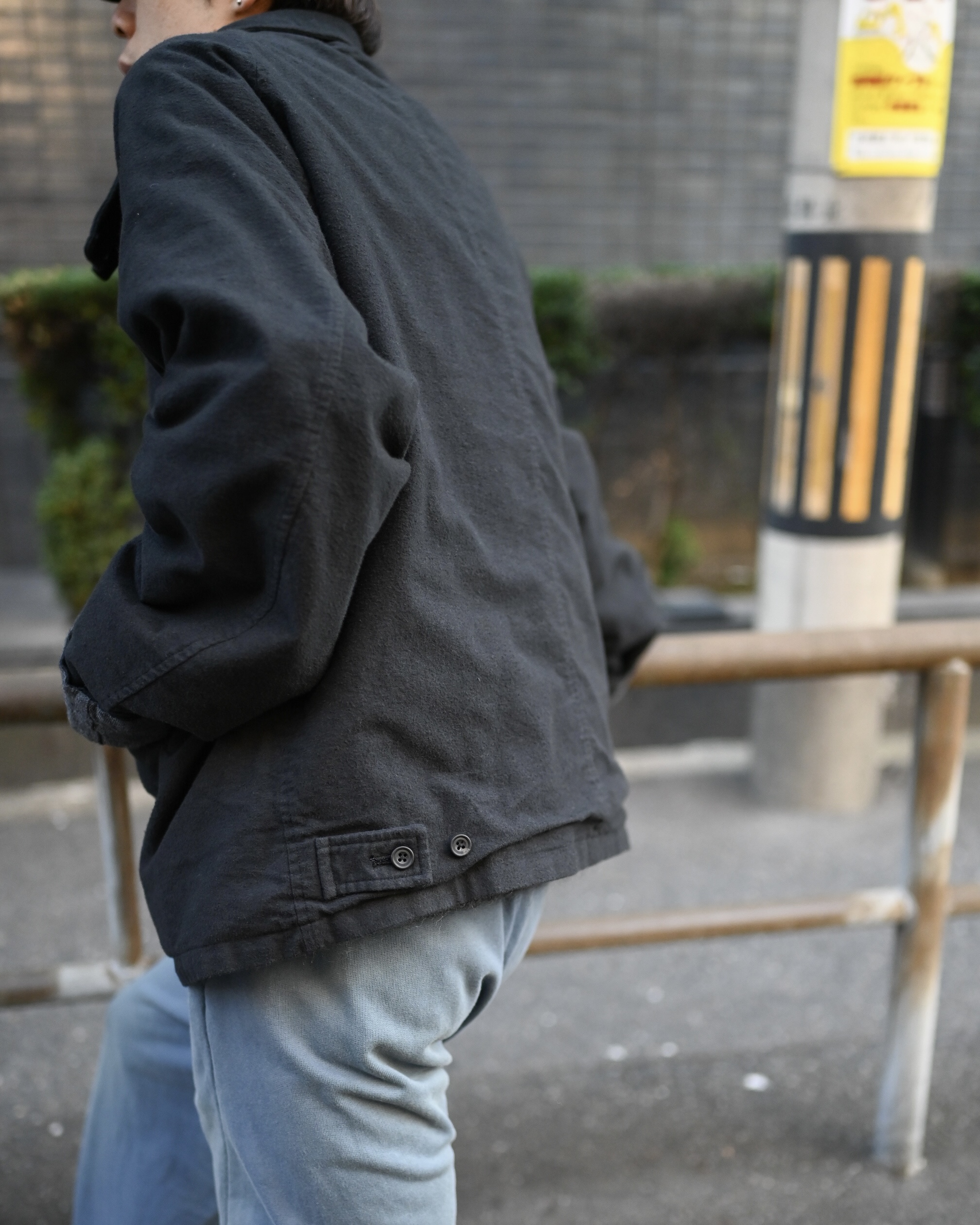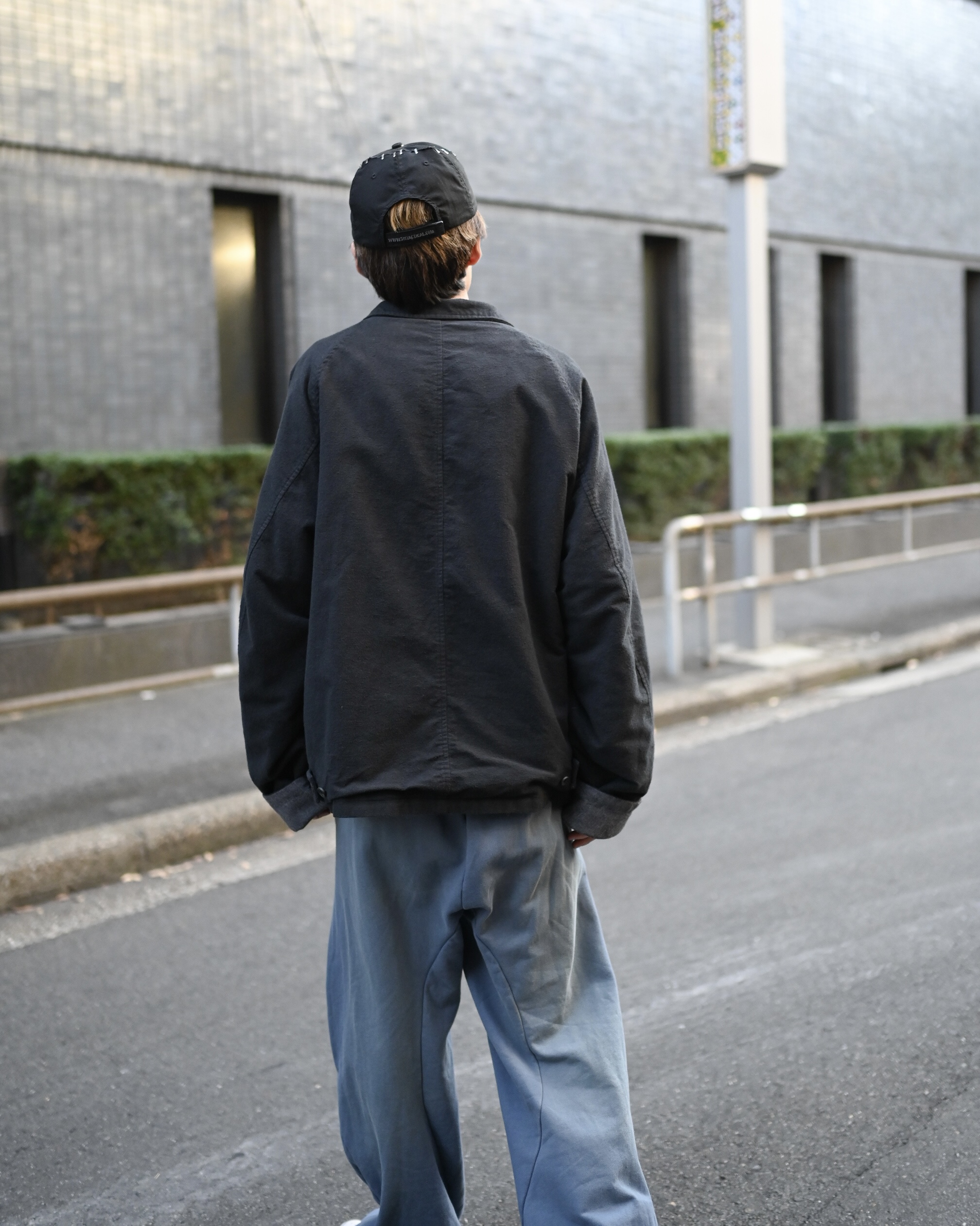 ウォッシュもかけられ両面共に古着のような良い風合い且つ、独特なパターンが体に自然に沿うシルエットに仕上がっております。着丈は長過ぎず短過ぎず、身幅は広めで袖丈が長く取られているので折り返して2トーンでの着用も程よいアクセント。