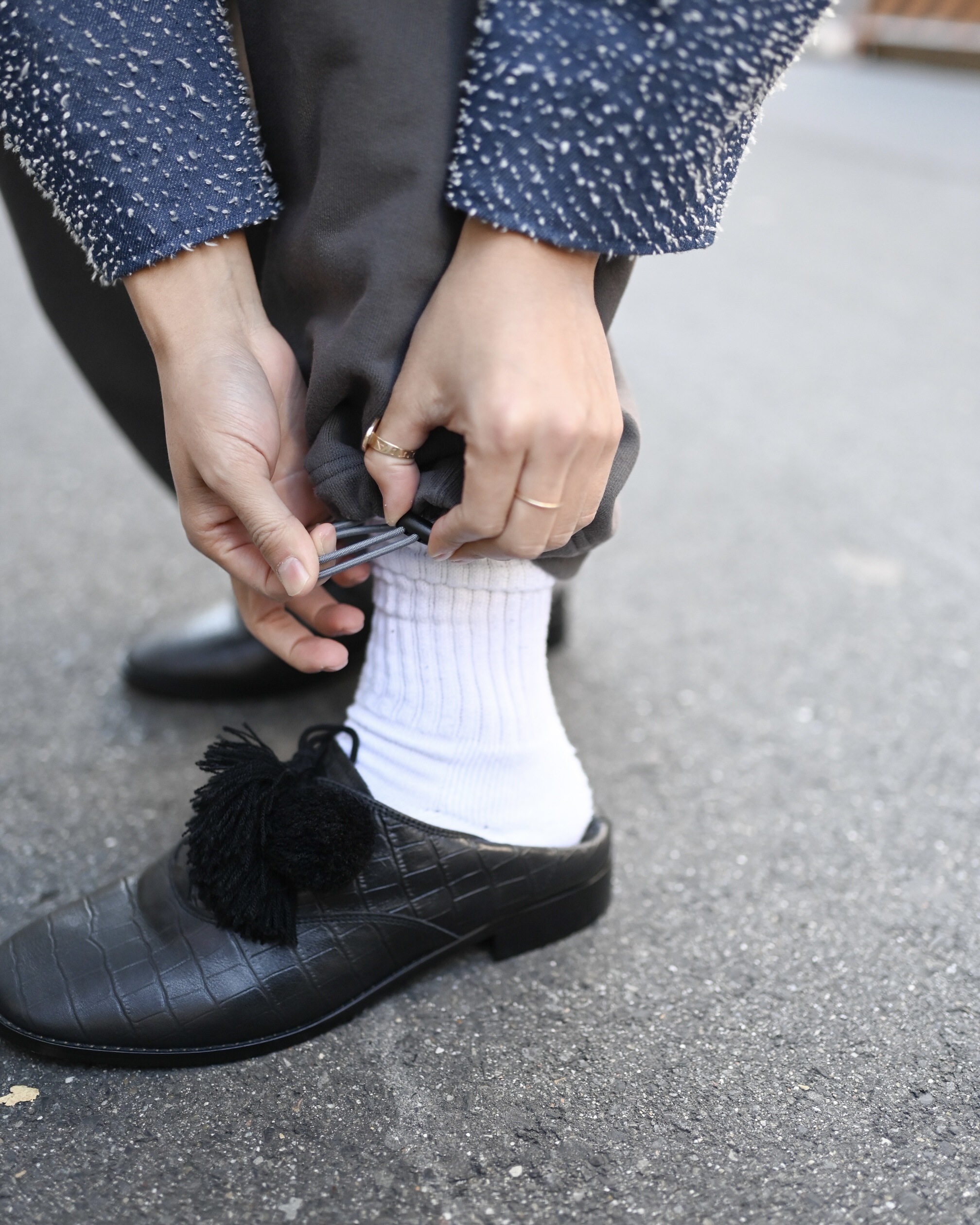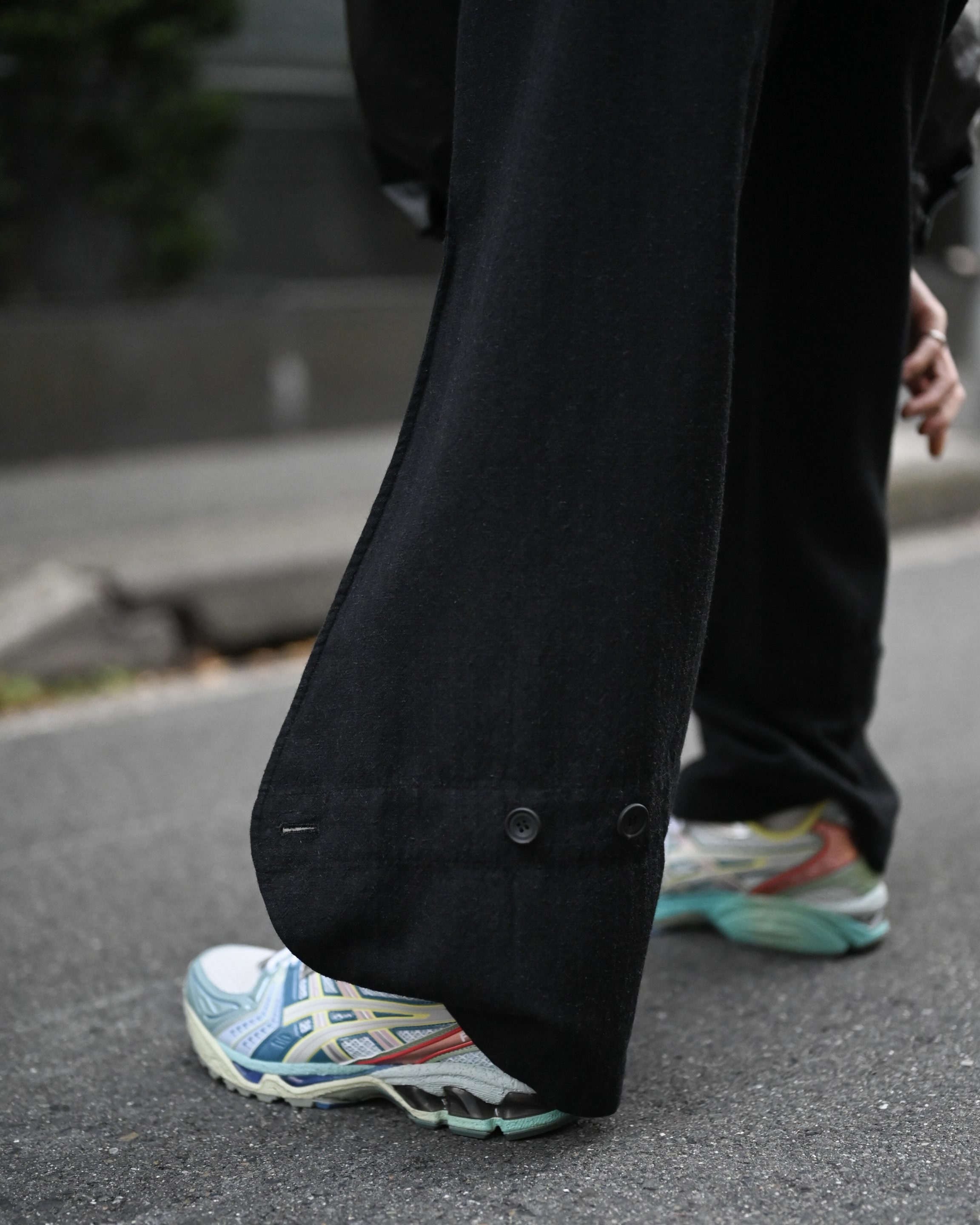 〈call〉のシグネチャーでもある裾に取り付けられたボタンにより、凧のようにシルエットを広げての着用ができる特徴的な裾周り。ボタンを留めず外に開いたようなシルエットから、ストンと落ちるストレートシルエット、奥でボタンを留めると弱テーパードに。合わせるトップスやシューズ、その日の気分で変幻自在なパンツ。