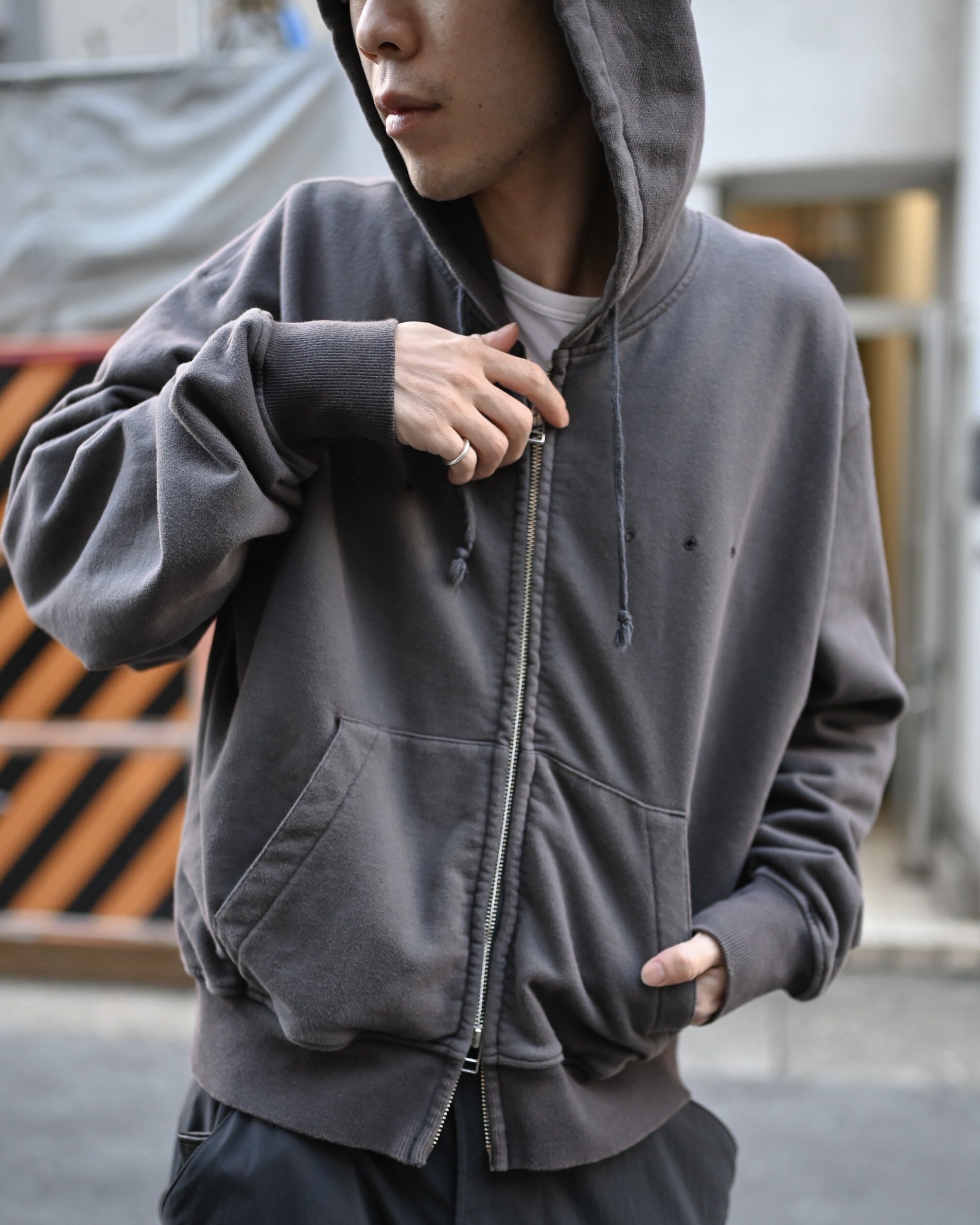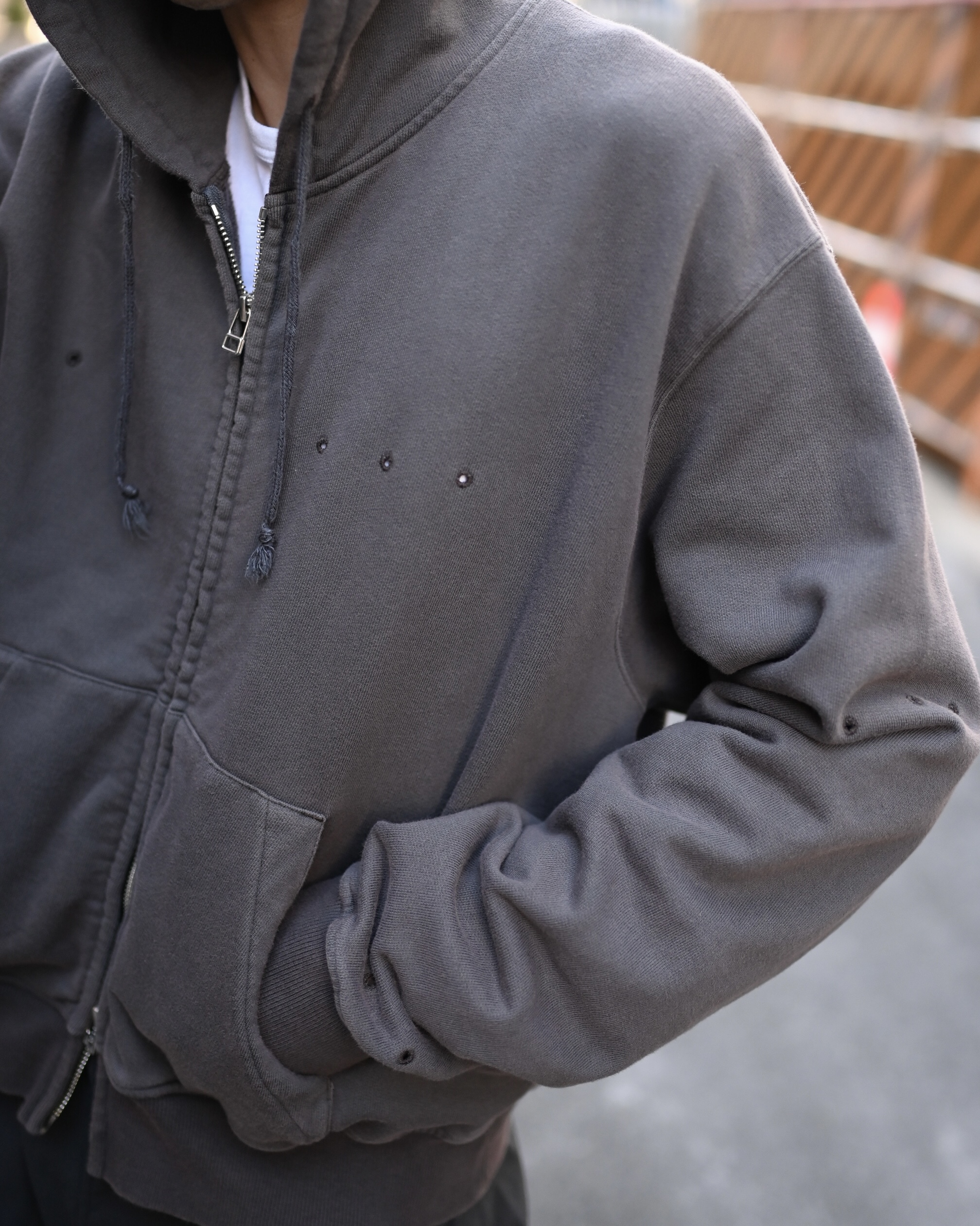 加工によって古着のような色味と風合いに仕上がったボディに、短丈・身幅広めのワイドパンツが主流な今取り入れやすいシルエット。胸元やアームにはピンバッチが付けられるよう菊穴が開けられており、自分だけのカスタムもお楽しみいただけます。